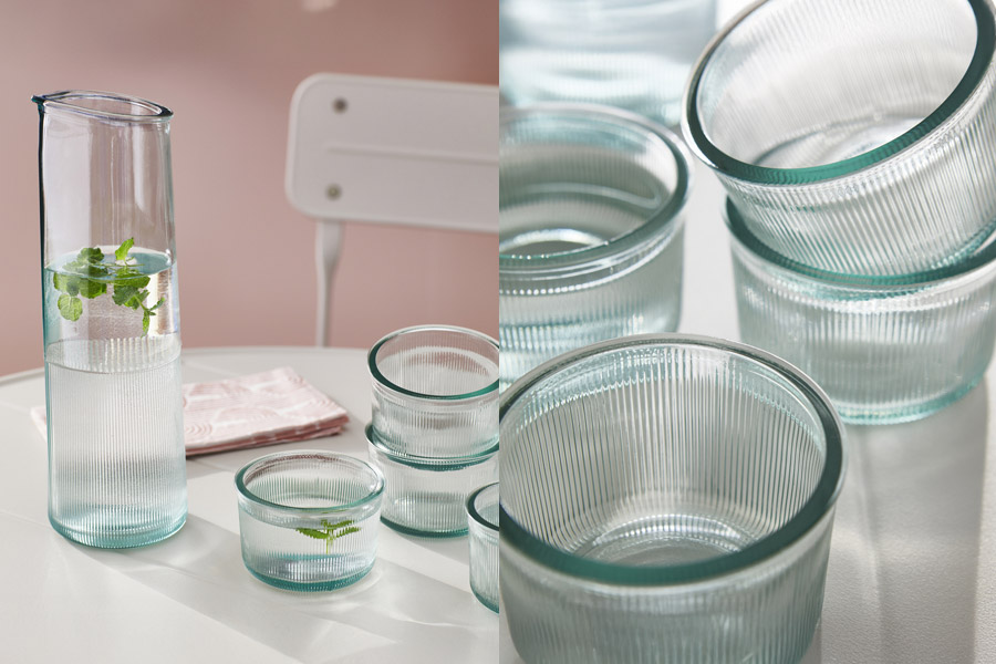 Give fresh water what it deserves with the beautiful, green tinted BERGVATTNET carafe and glass in ripple design. Made from 100% recycled glass.
