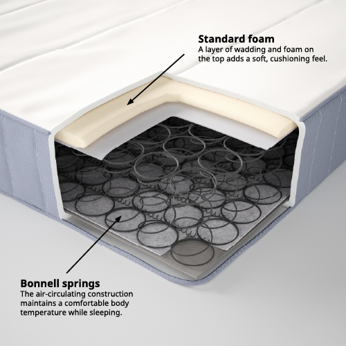 IKEA strictly controls the formaldehyde content, and insists that we don’t use chemical substances that are harmful to people and environment. We used a sleeping robot to imitate the human body and roll 50,000 times to test for durability. We provide 10-years guarantee for the quality of many mattresses.