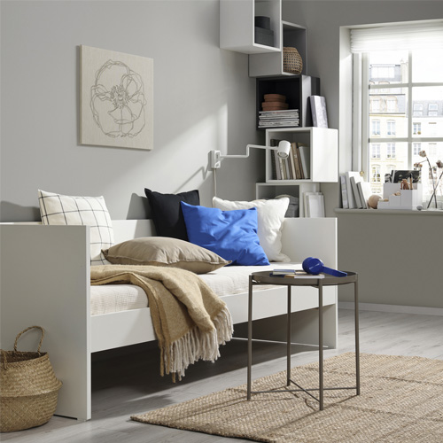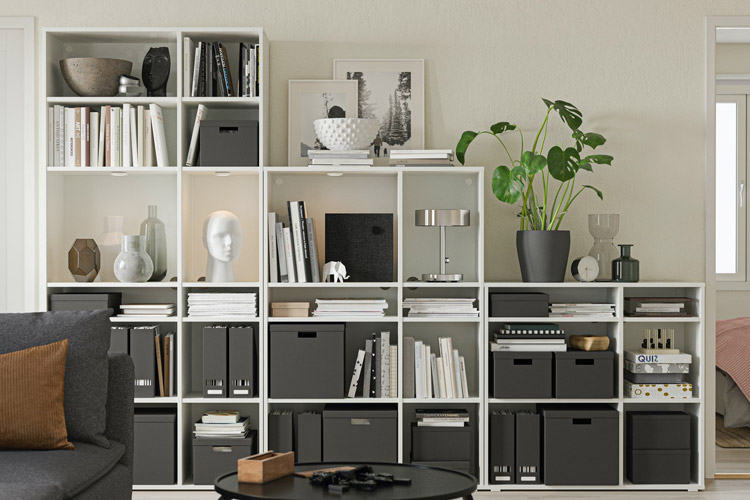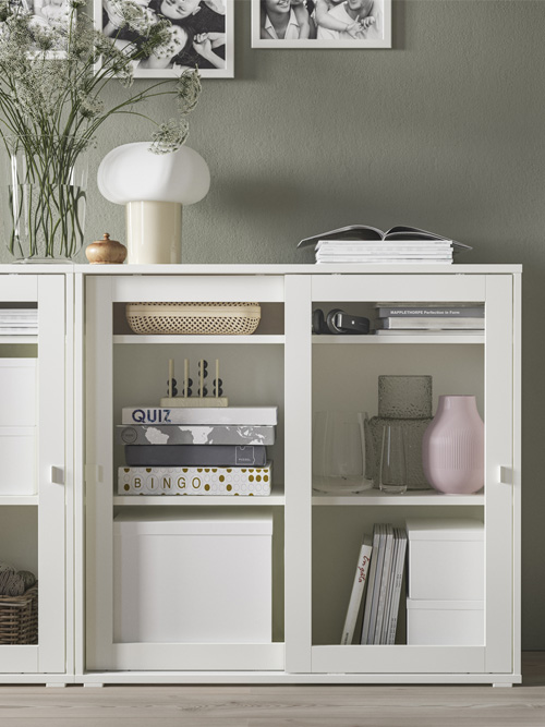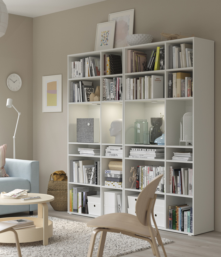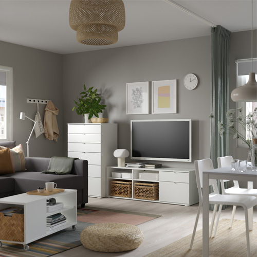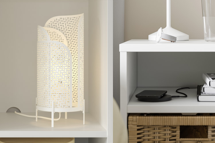 VIHALS storage series elegantly accommodates your IKEA Home smart system, chargers and decorative lighting by discreetly leading messy cables through the outlets in the back.