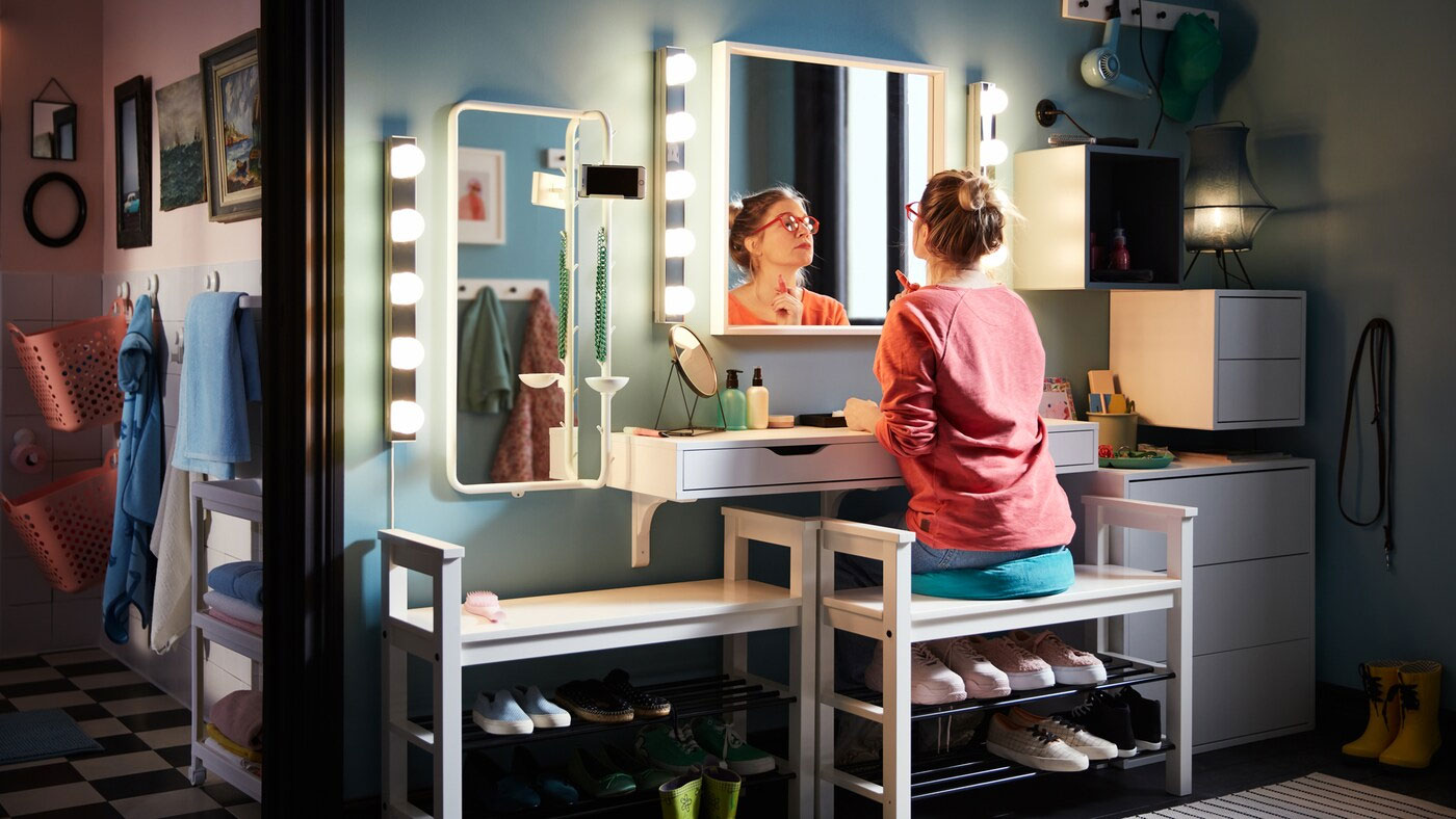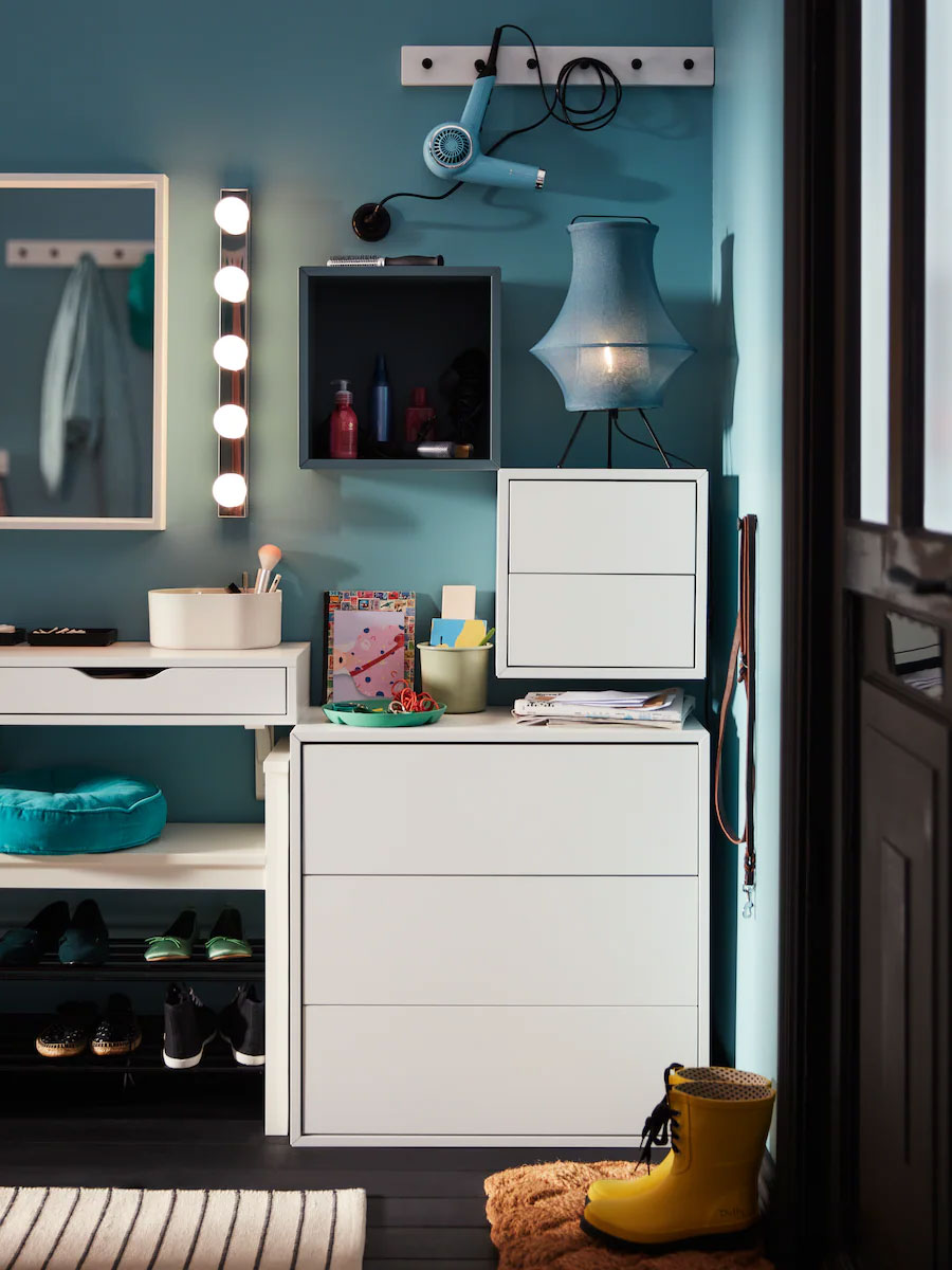 A simple wall-mounted shelf with drawers and a mirror above make a great, compact styling station, especially with lights like these. And to make things even smarter, the bench you’re sitting on maximises your space by doubling as a shoe rack.