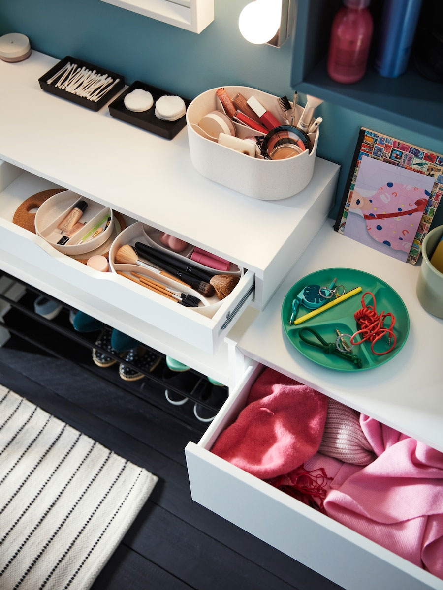 Small storage helps you get a quick overview of your makeup and styling options. Finding what you want without rummaging through clutter is generally a good way to make your morning routine less stressful.