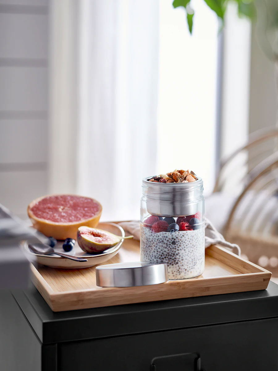 Working from home often means eating at your desk – things just have that way of blurring. And why fight it? Get a handy tray to settle in properly with your lunch, and perhaps a smart jar with insert to keep your snacks fresh for longer.