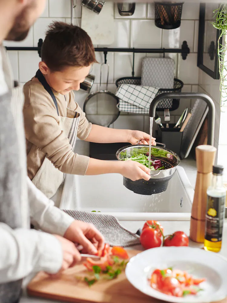 Playing with water is always fun. Splashing, spraying, pouring, rinsing. It feels good, it sounds good and it’s messy. What’s not to love? So, if you want to get the kids involved in the kitchen, let them do the water-based tasks. From rinsing the salad to washing up, the kitchen is a treasure trove of constructive water games.