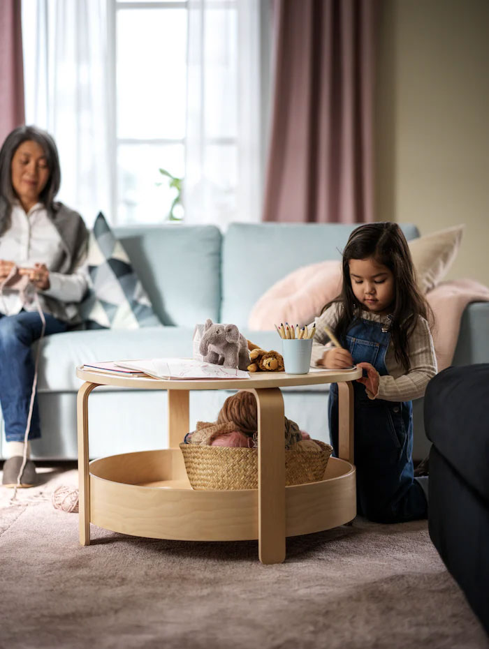 to_cate_mondayThe furniture you choose not only affects the look and function of a room, it can also make it more or less kid-friendly. A table like this is a good choice because it has a lip around the tray to prevent things getting knocked off and also has rounded, bump-friendly edges. Add in the extra storage and light, airy look, and you have a winner all round.