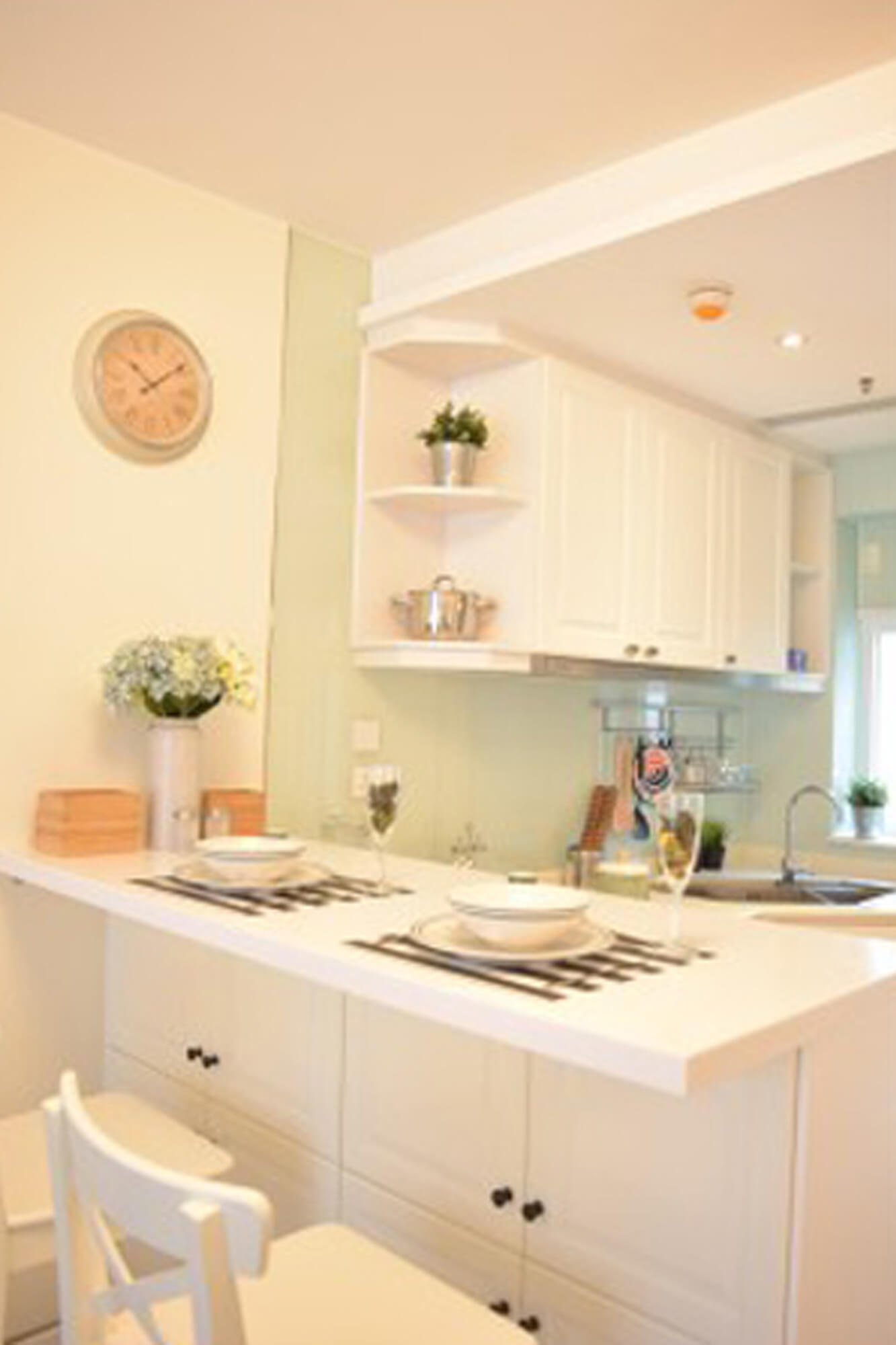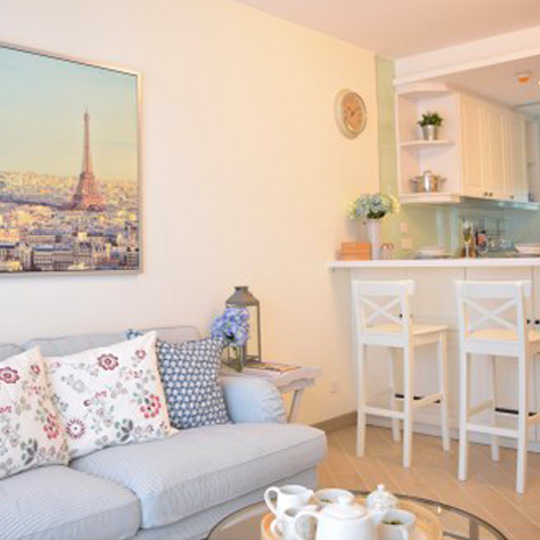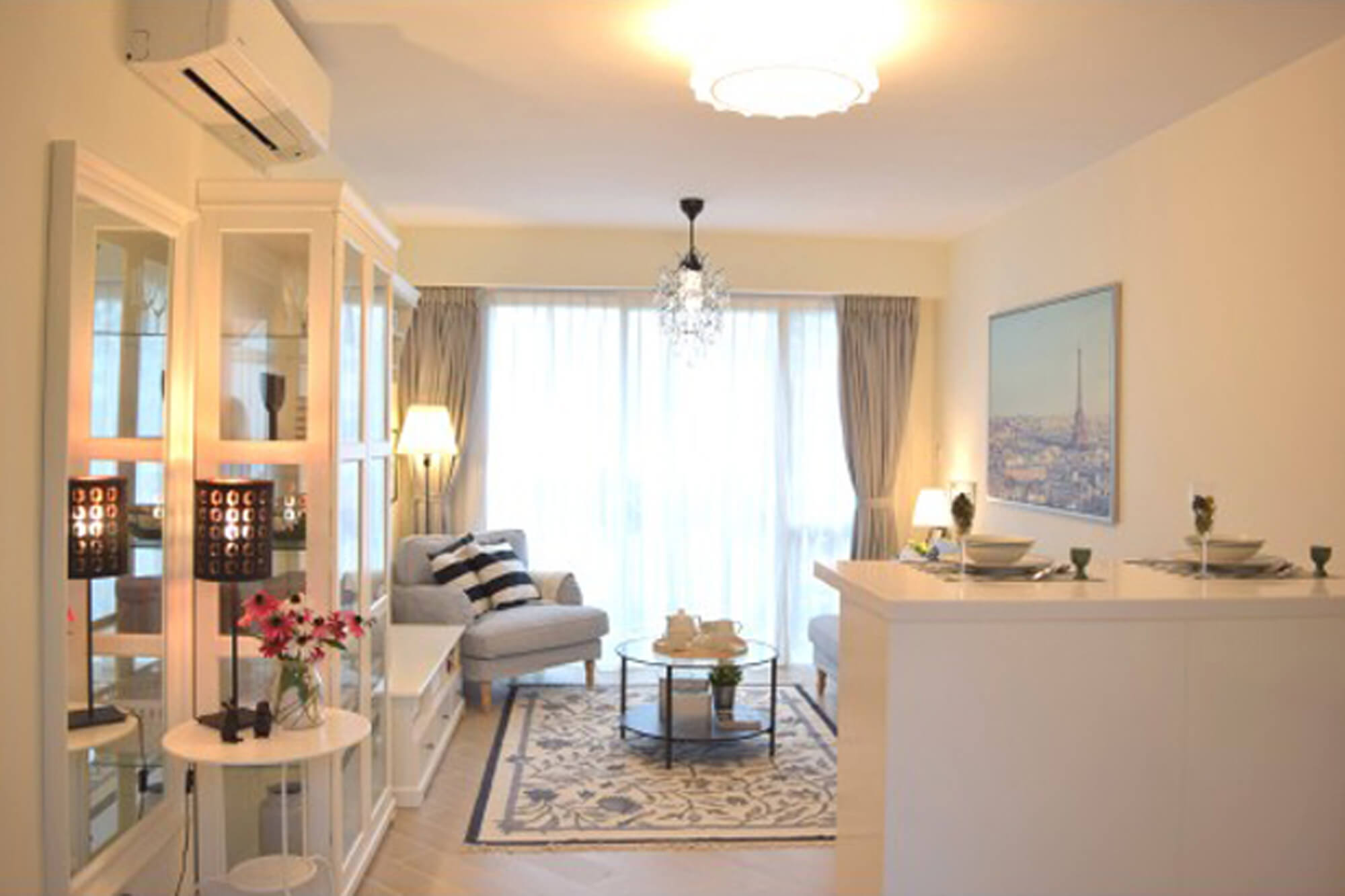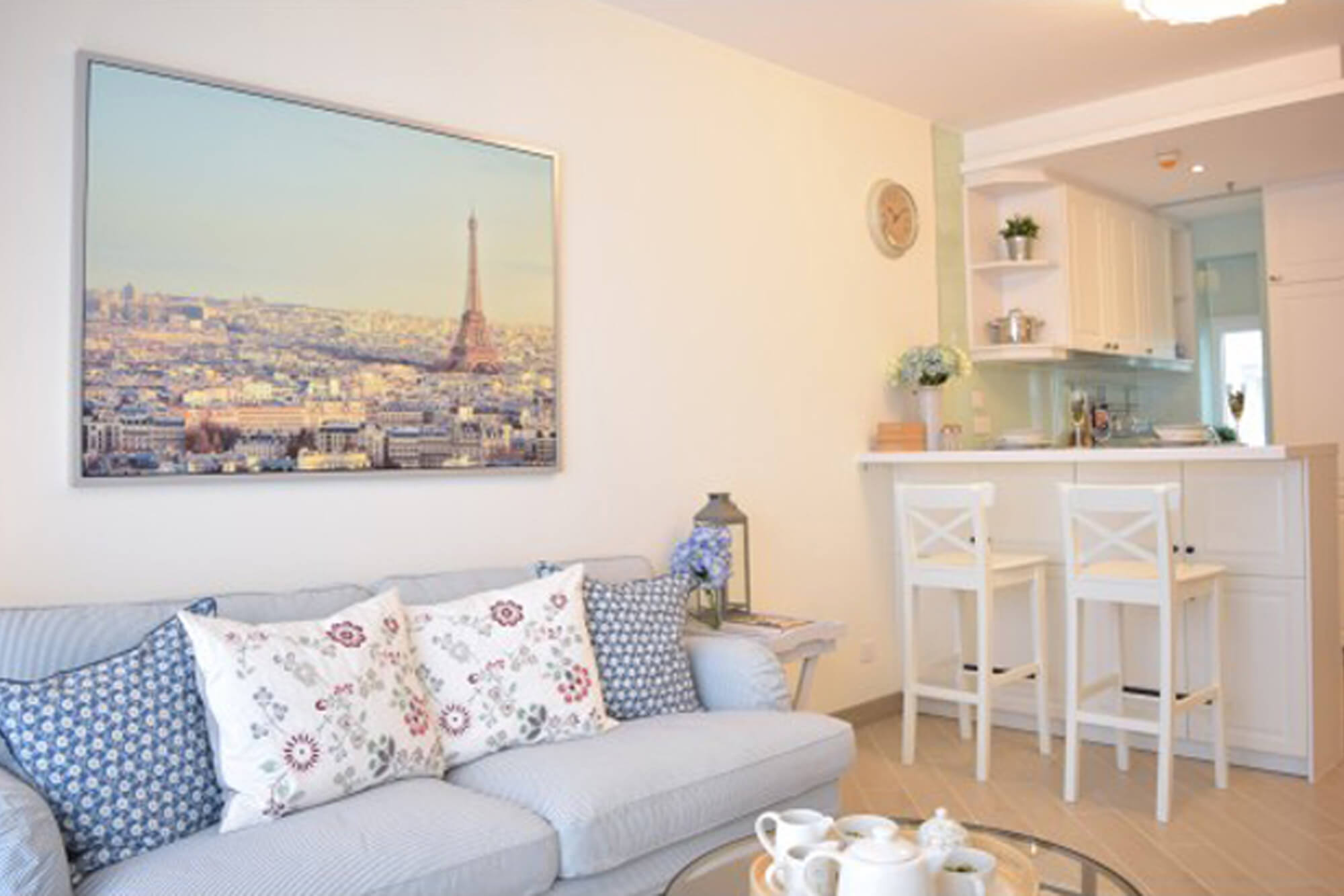 Rustic style is a popular choice for many people, but it requires some larger furniture pieces. To highlight the sense of spaciousness, we picked a palette of white, beige and light blue, and balanced it with some black decorations. The open kitchen and the living room are divided by a bar counter that provides extra worktop area and makes the most of the space.