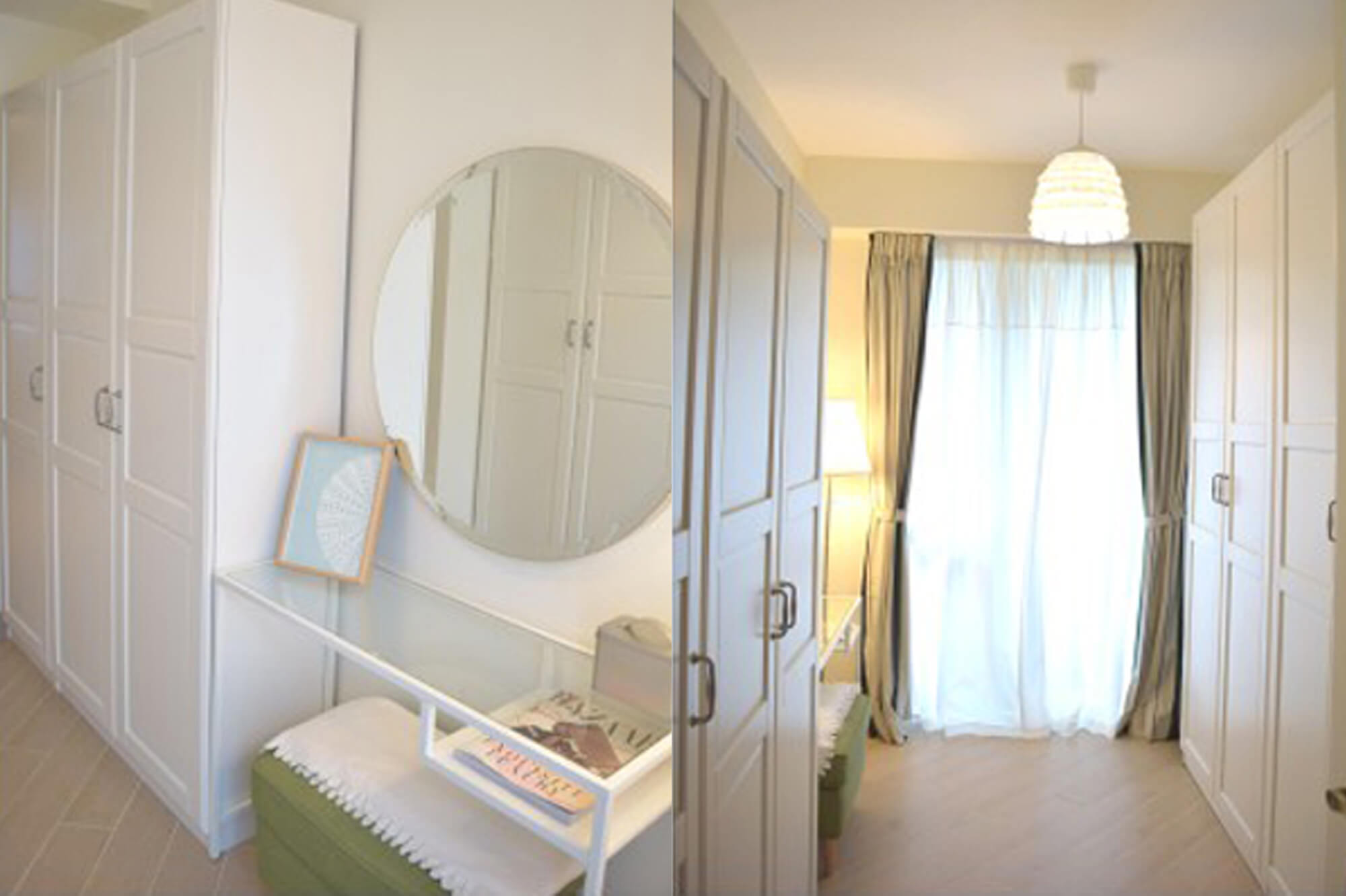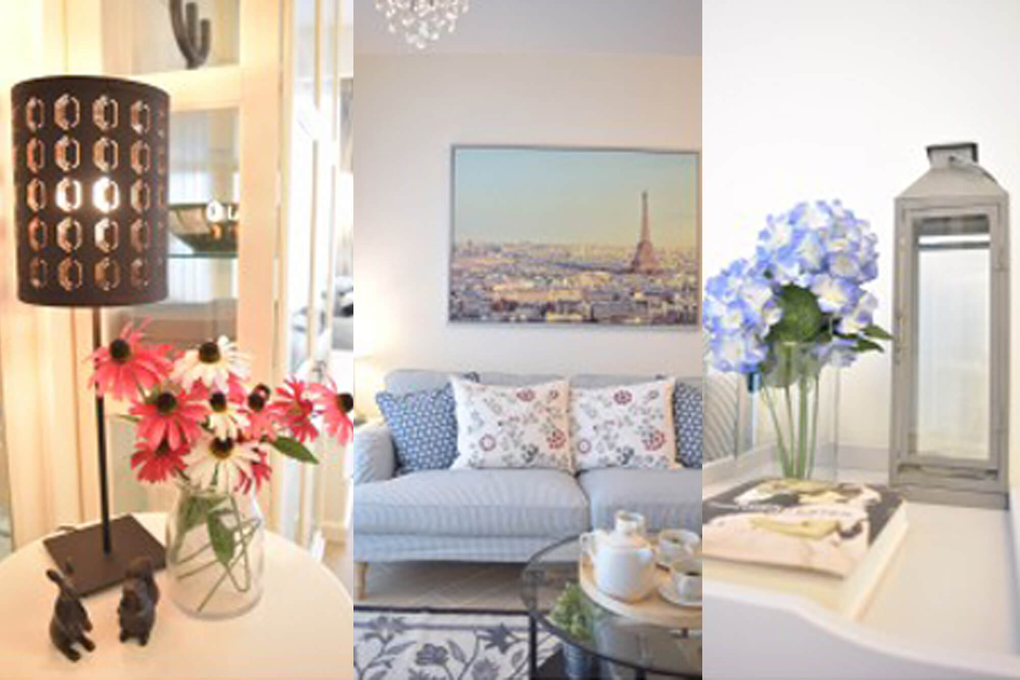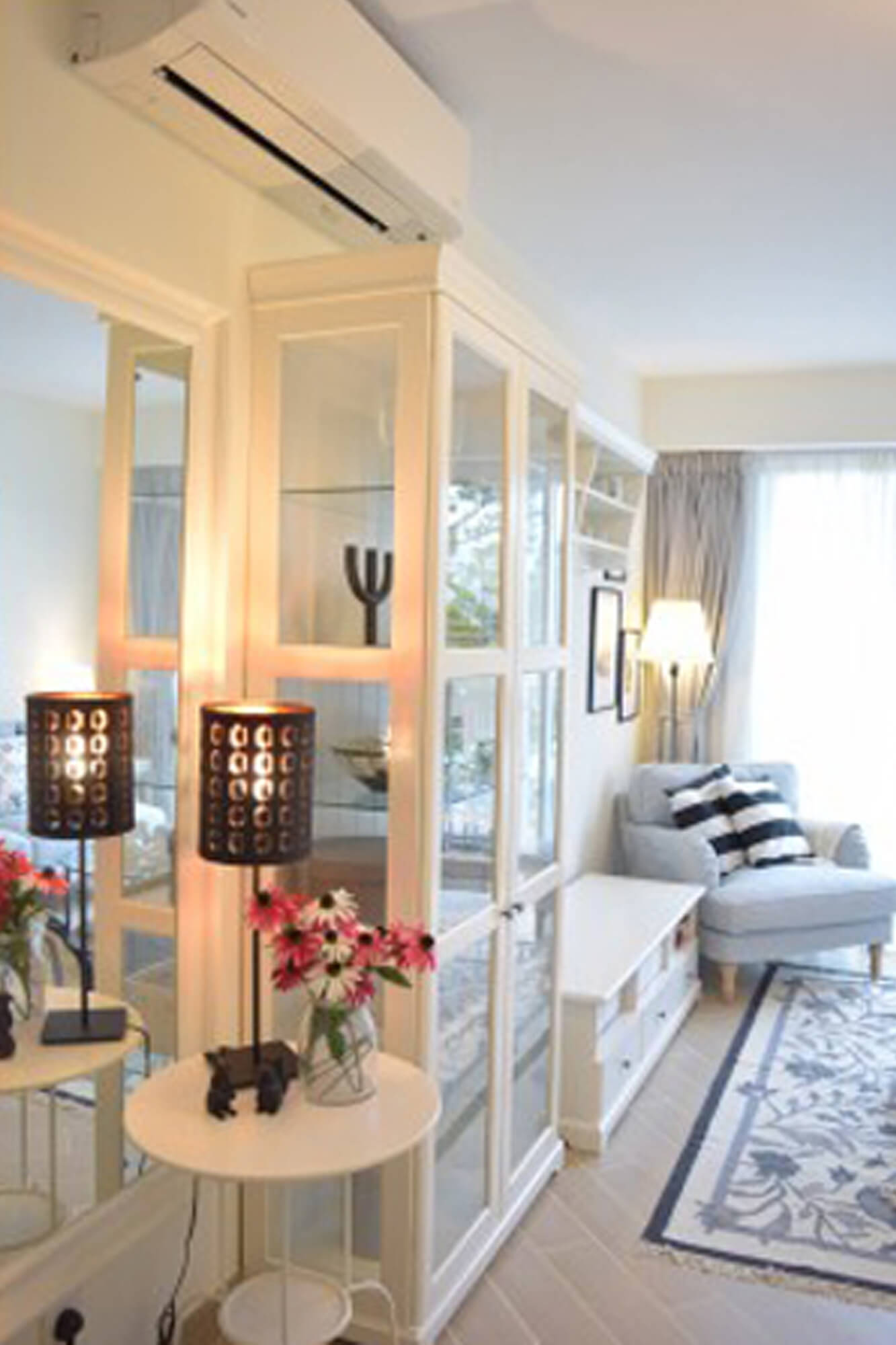 Rustic style is a popular choice for many people, but it requires some larger furniture pieces. To highlight the sense of spaciousness, we picked a palette of white, beige and light blue, and balanced it with some black decorations. The open kitchen and the living room are divided by a bar counter that provides extra worktop area and makes the most of the space.