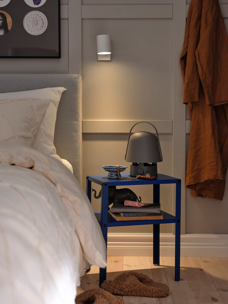 Against layers of soft grey, the blue table and lamp energise the colour palette and elevate the contemporary feel, especially when combined with curios and books in light and vibrant colours. The lightweight and versatile bedside table is a handy helper that can easily join you wherever you are in the room.