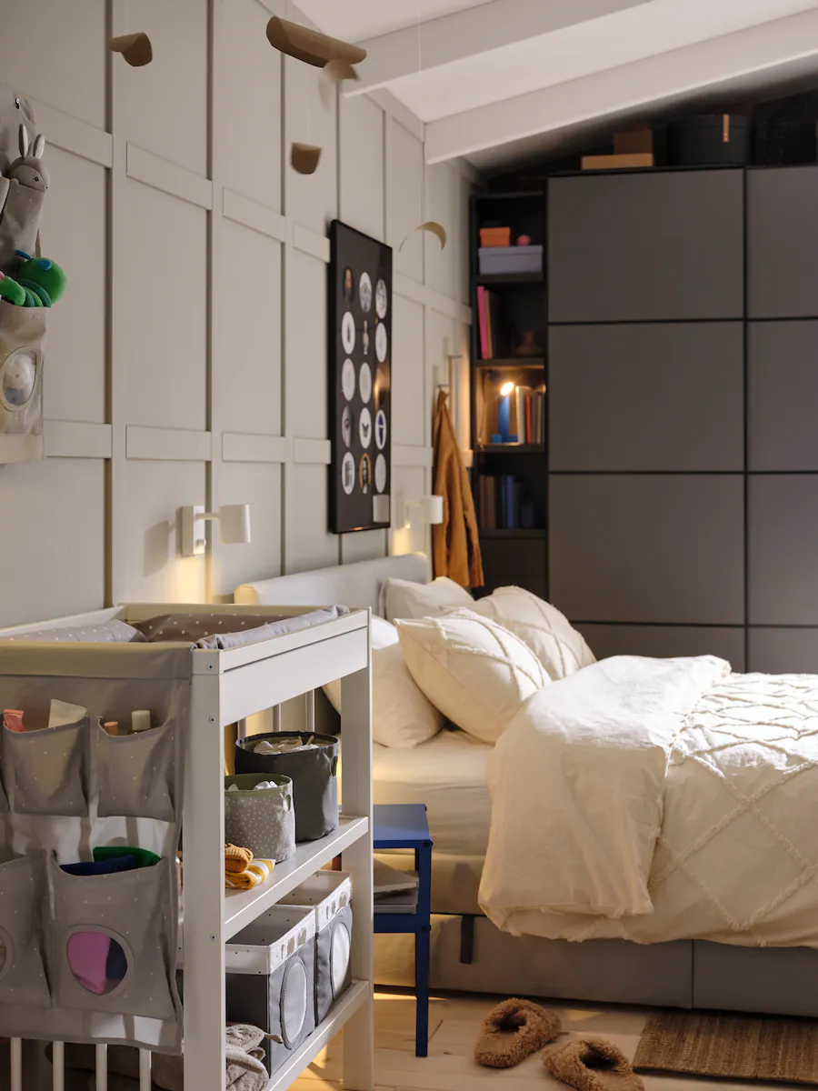 Timeless greys elevated by off-whites and a blue pop set an elegant yet modern scene here. It transforms this bedroom into an uncluttered, get-away-from-it-all parent and baby oasis. Discover how a clever mix of furnishings, accessories and tone-on-tone colour create a space with something for everyone.