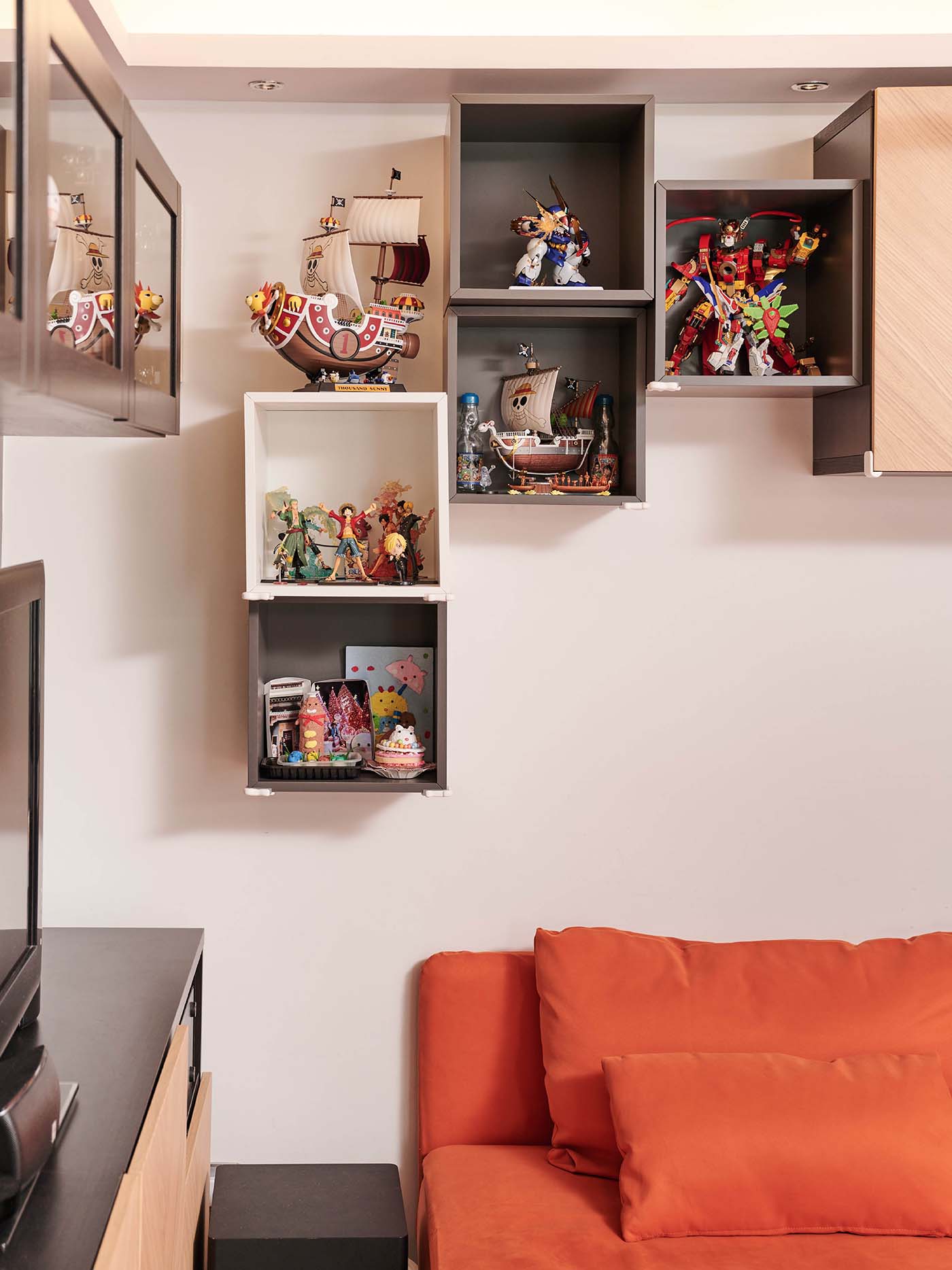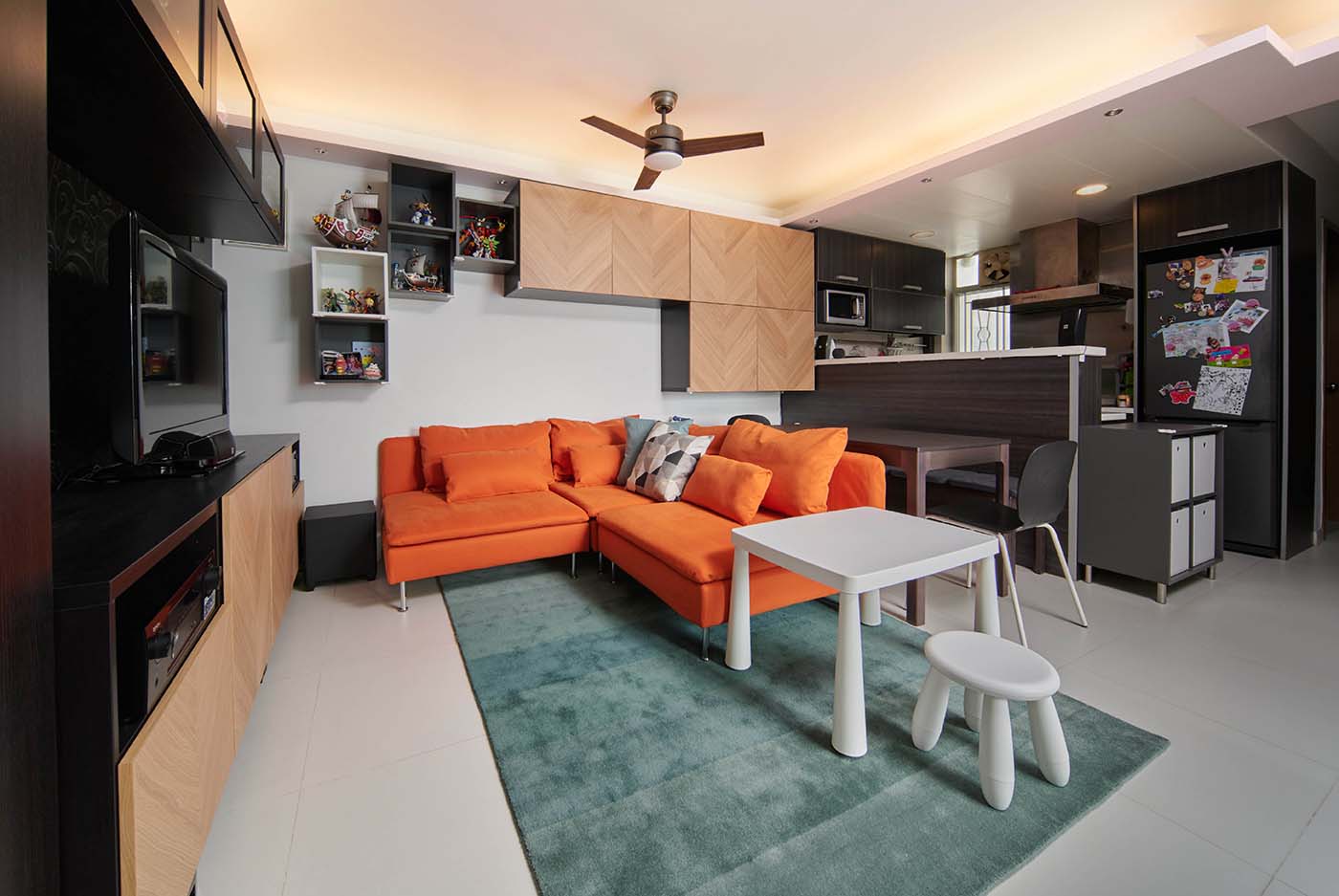 Modular sofa units can be rearranged as needed, transforming from a L-shaped sofa to a generous long sofa or even two sofas facing each other. By moving the sofa forward, the extra space can accommodate a dining table and a space-saving bench. Now the family can have a proper meal together!