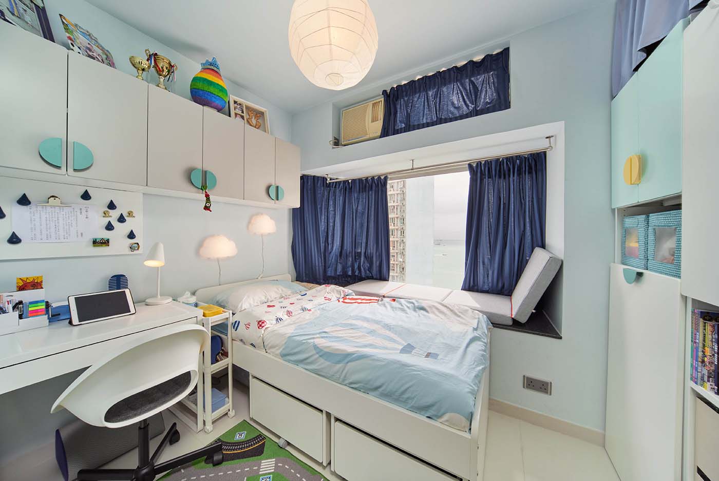 The child did not like his old bedroom as he felt abandoned in there. The refurnished space now becomes a dream room that fulfills his every need. There is a nice spot for learning, and a reading corner on the windowsill. Under the bed is the toy storage that can turn the room into a playground.