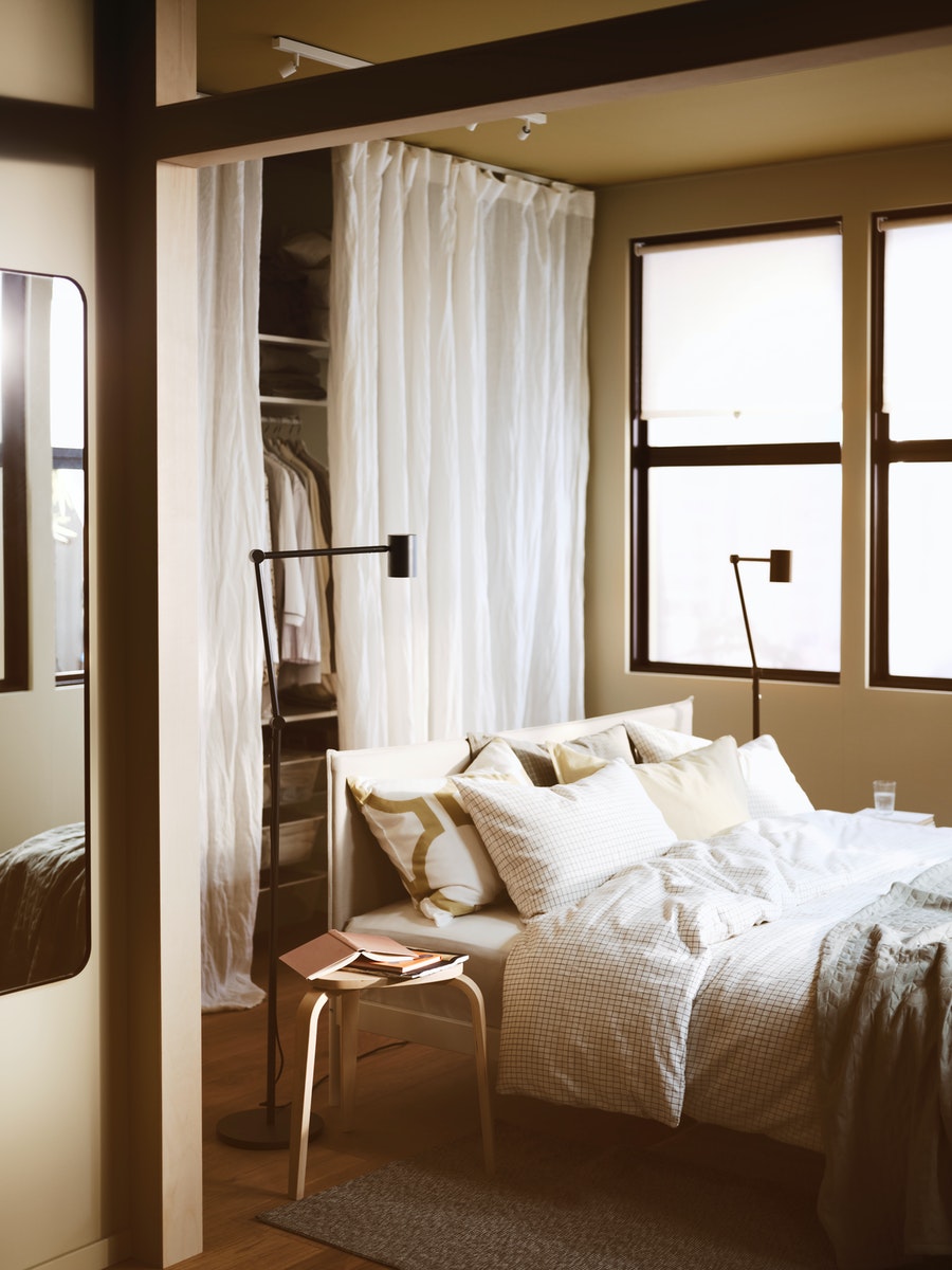 A free-floating bed immediately greets you as you walk into their bedroom. With just three walls, the placement opens the space up for other things, with the bed creating a natural walkway behind for them to open a curtain and access their impeccably organised clothing collection.