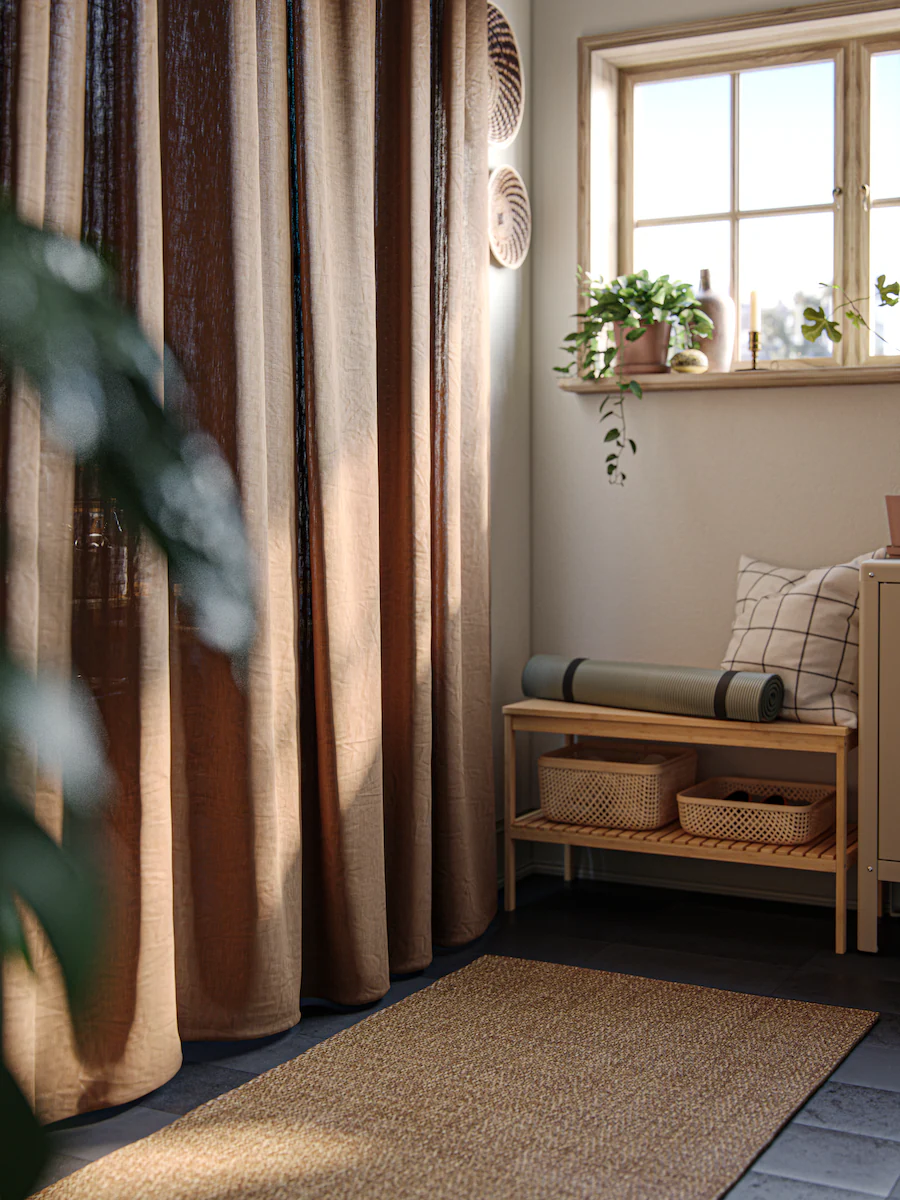 From hidden to hardworking in a second. Keeping your laundry supplies in a trolley – in beautiful natural bamboo – makes them easy to grab and organise. A pair of timeless dark beige curtains in crushed linen work as a tactile room divider and bring a clean and cosy feeling to your room.