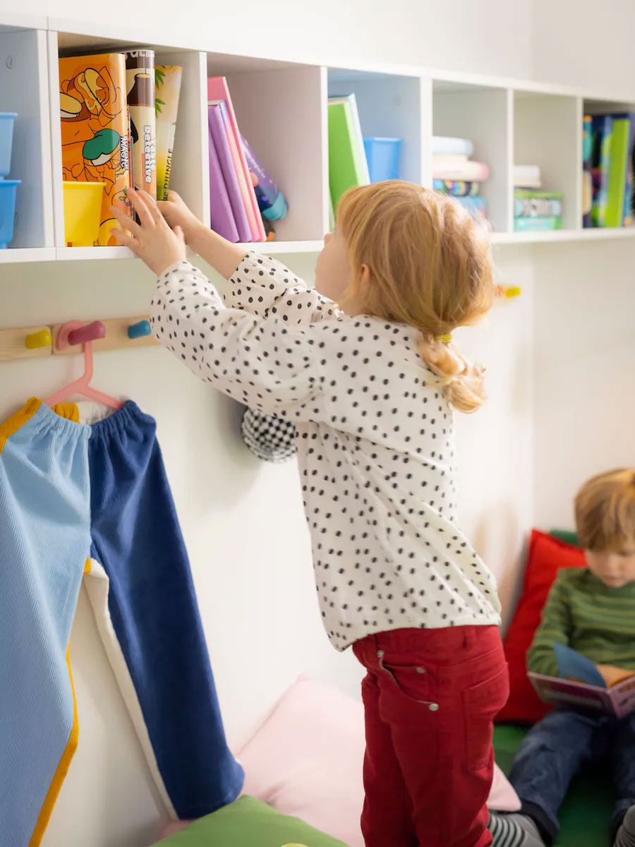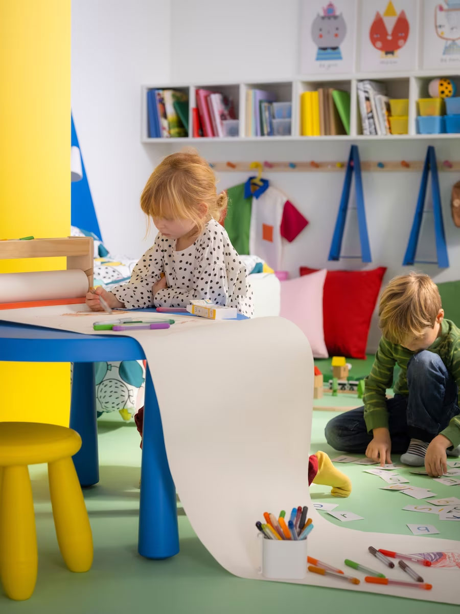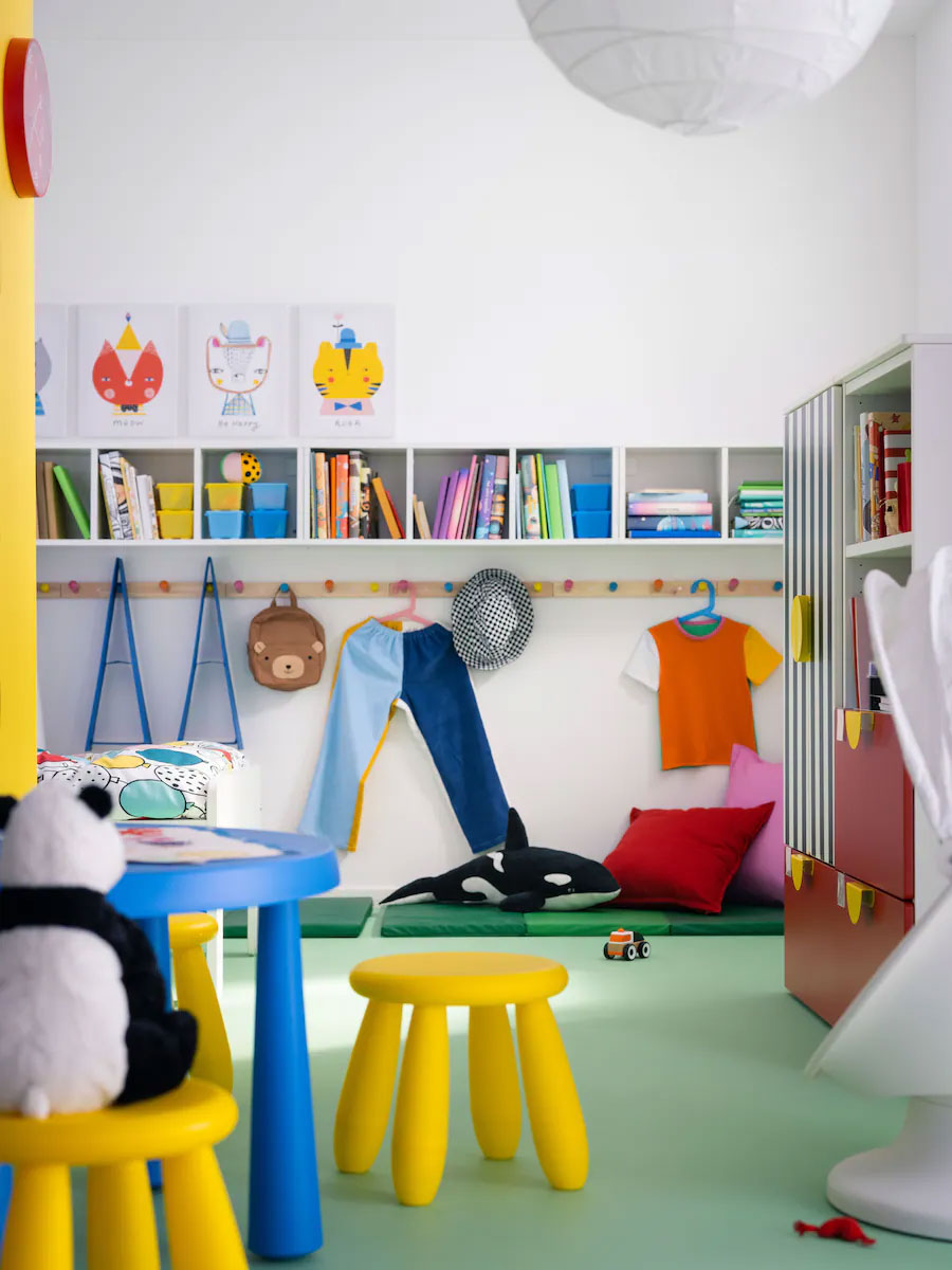 Pegboards, plus some stools and a spacious table in colours perfect for the style of the room, form a zone for activities like drawing. With an area just for this, tidying up can wait when the kids move on to something else. The pegboards are placed so kids can reach their materials and display their art themselves.