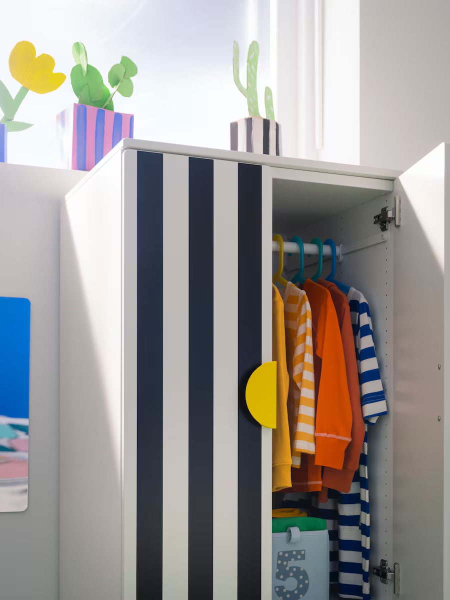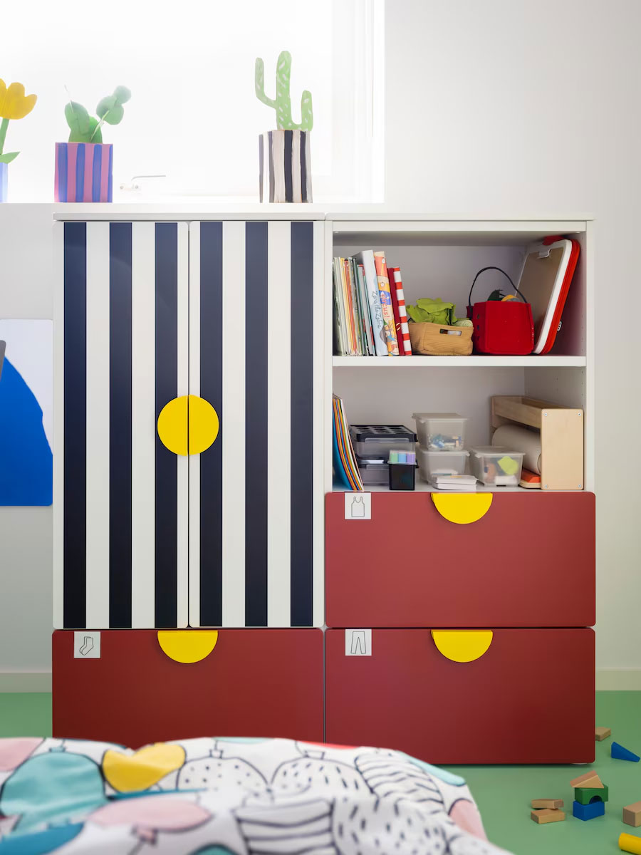 Storage like this at the right height for them means kids can see and reach their things by themselves. And its big, bold stripes and round handles are examples of the strong, geometric shapes that create playfulness and inspire the imagination in this room.