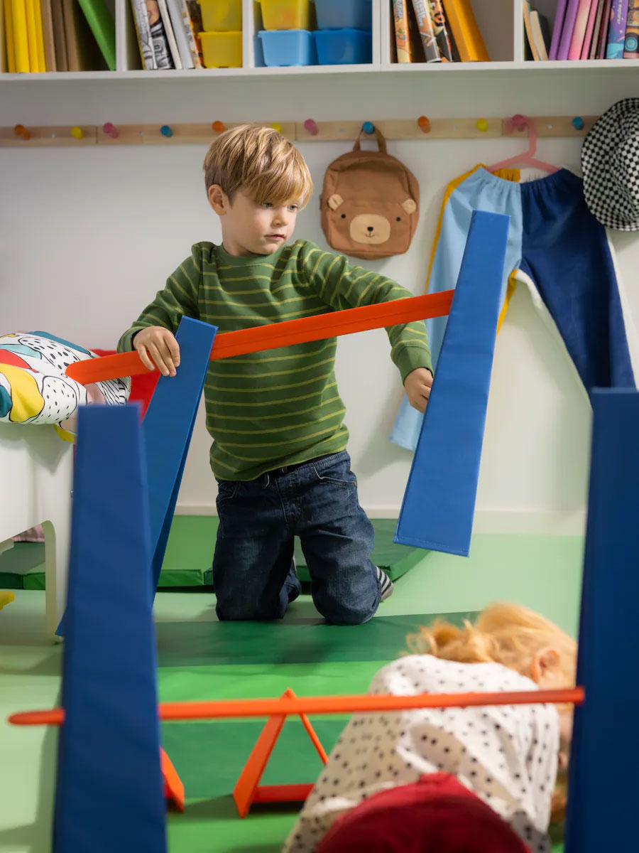 Full of colour, geometric shapes and strong patterns, this room is also neat and organised, with storage at the right height that helps kids take care of their own stuff. It’s a place for everything from reading to doing an obstacle course to falling asleep after a bedtime story at the end of a happy day.