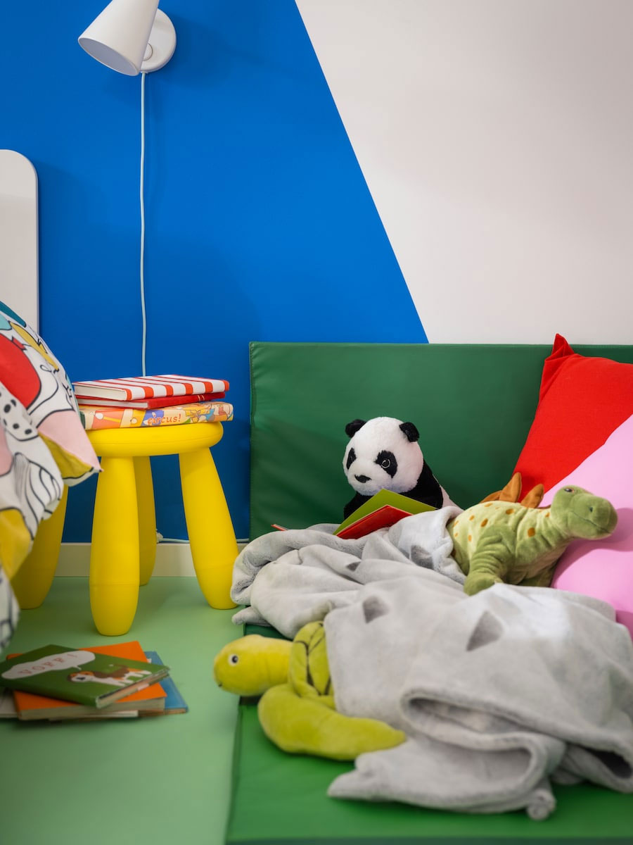 Here’s a nice nook where kids can read with their parents or on their own. There’s tidy, easy to get at storage for books, toys and clothes. The white walls provide a blank canvas, with the cushion covers, the soft gym mat and the knob rack adding colour to suit the style of the room.
