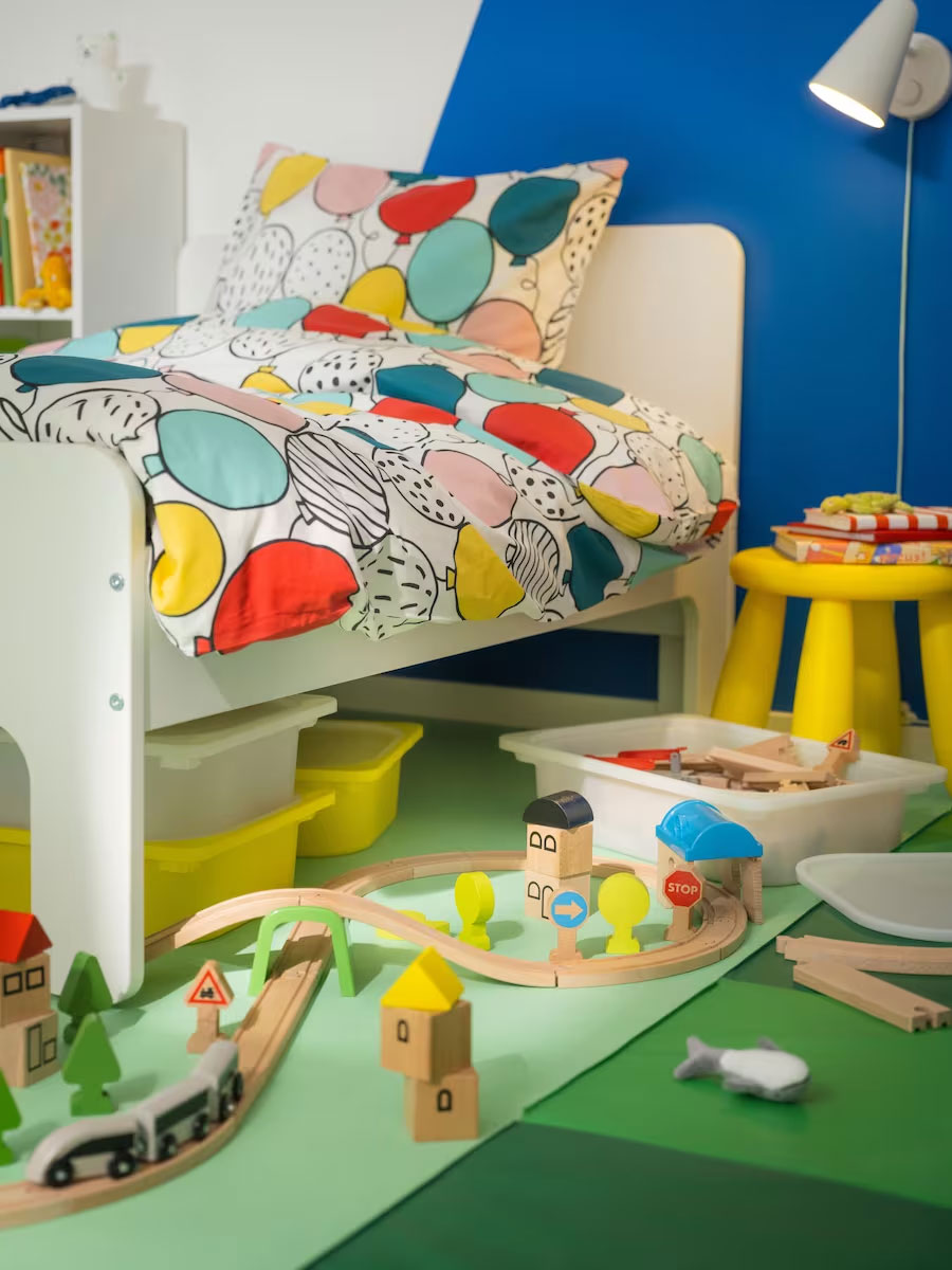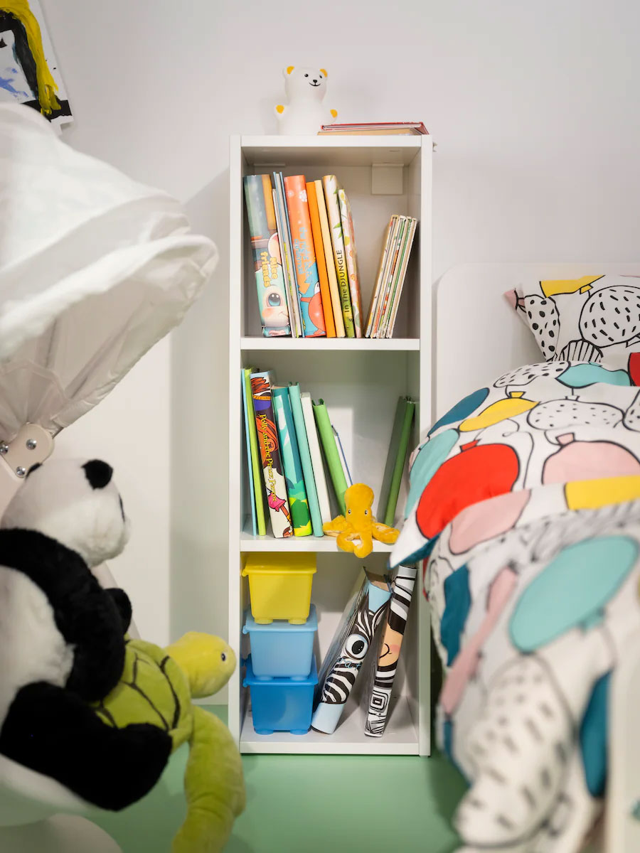 This shelf unit makes it easy to access bedtime books and more and it’s a great place for a night light. The bed has space underneath for storage boxes, and bed linen on top with a bold pattern that enhances the fun, colourful style of the room.
