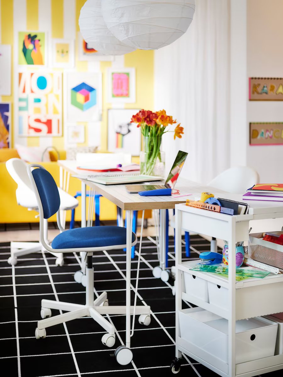 When room rearrangement is part of your everyday flow, wheels are truly the way to go. Chairs, trolleys, and tables all have castors, making the space extra easy to arrange from one moment to the next. Also, the slimline furniture keeps the room light and airy. Study, play, work, repeat.