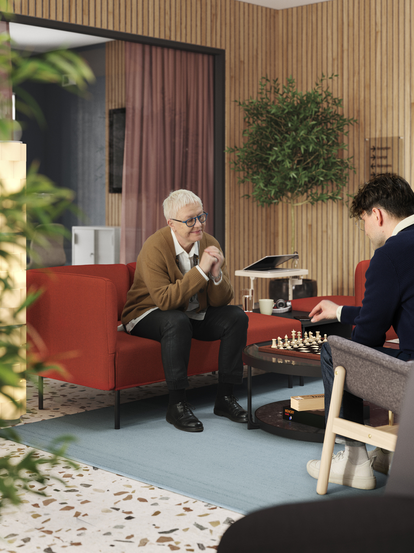 This super social seating draws people in with warmth and closeness. The main piece is LILLEHEM, a modular sofa that can be combined into a custom solution. This set up mixes low backs, armrests and an open end so that guests can easily use the side table. A VEDBO armchair radiates relaxation, and a big coffee table can hold games or newspapers. The rectangular rug and reappearing colours tie the area together.