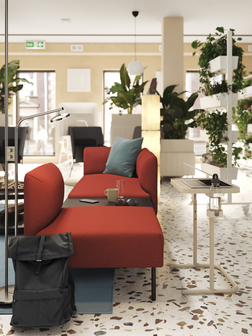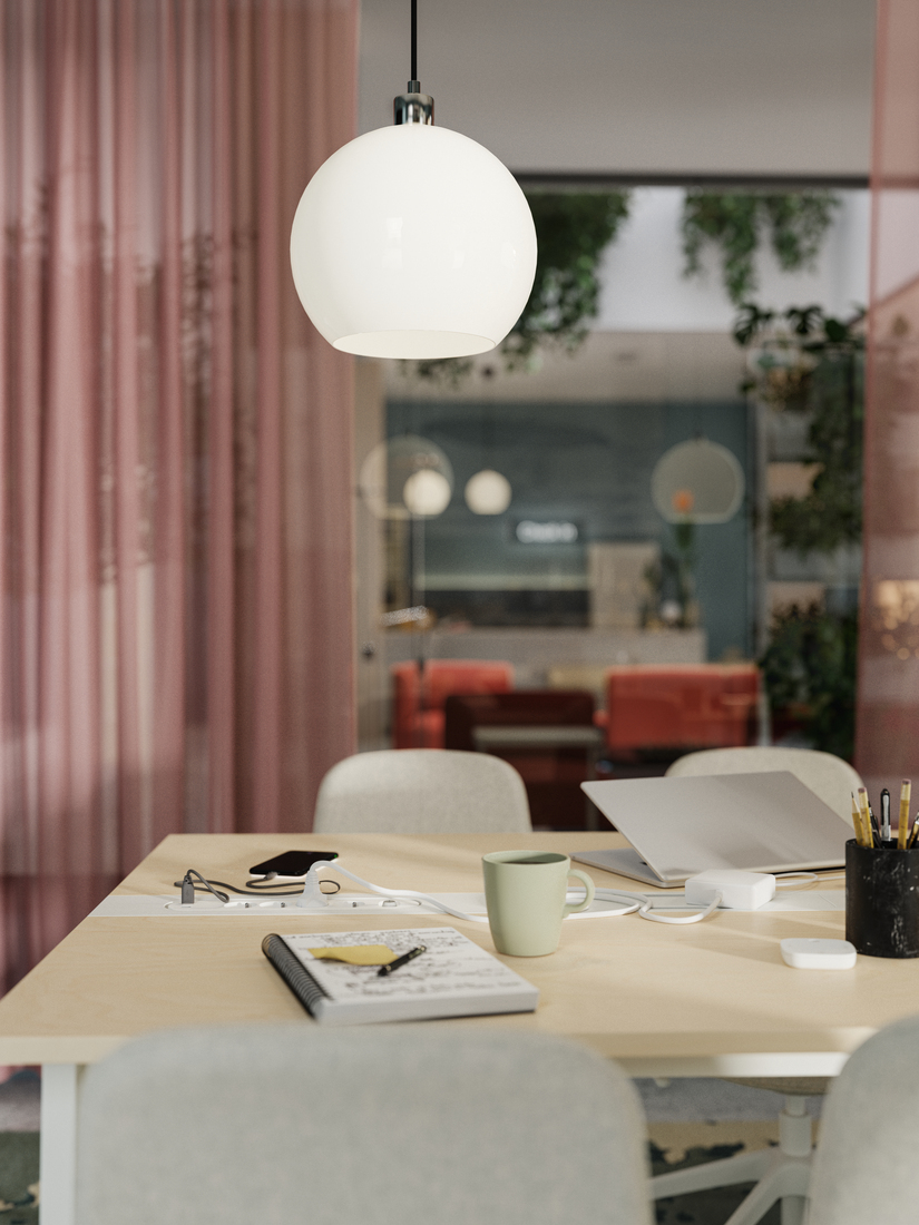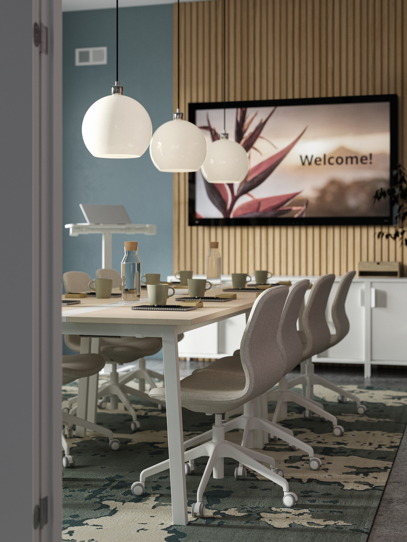 A big window links the spaces so that the meeting room doesn’t feel isolated. But the curtain lets attendees control privacy and focus. Both areas have furniture that matches in style and colour. Some are exactly the same, like JÄRPLIDEN pendant lamp and MITTZON pieces.