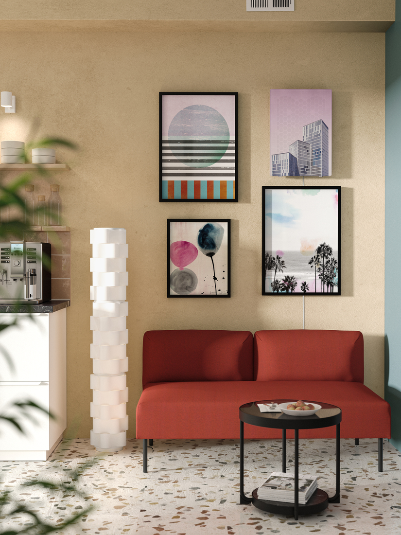 Signal mingling and refreshments with bar furniture like STENSELE tables and JANINGE stools that create plenty of room to sit or stand. Add in a lively mood from wall art and music. Guests can serve themselves coffee and a treat, whether they’re taking a break from an all-day offsite or kicking off their long holiday.