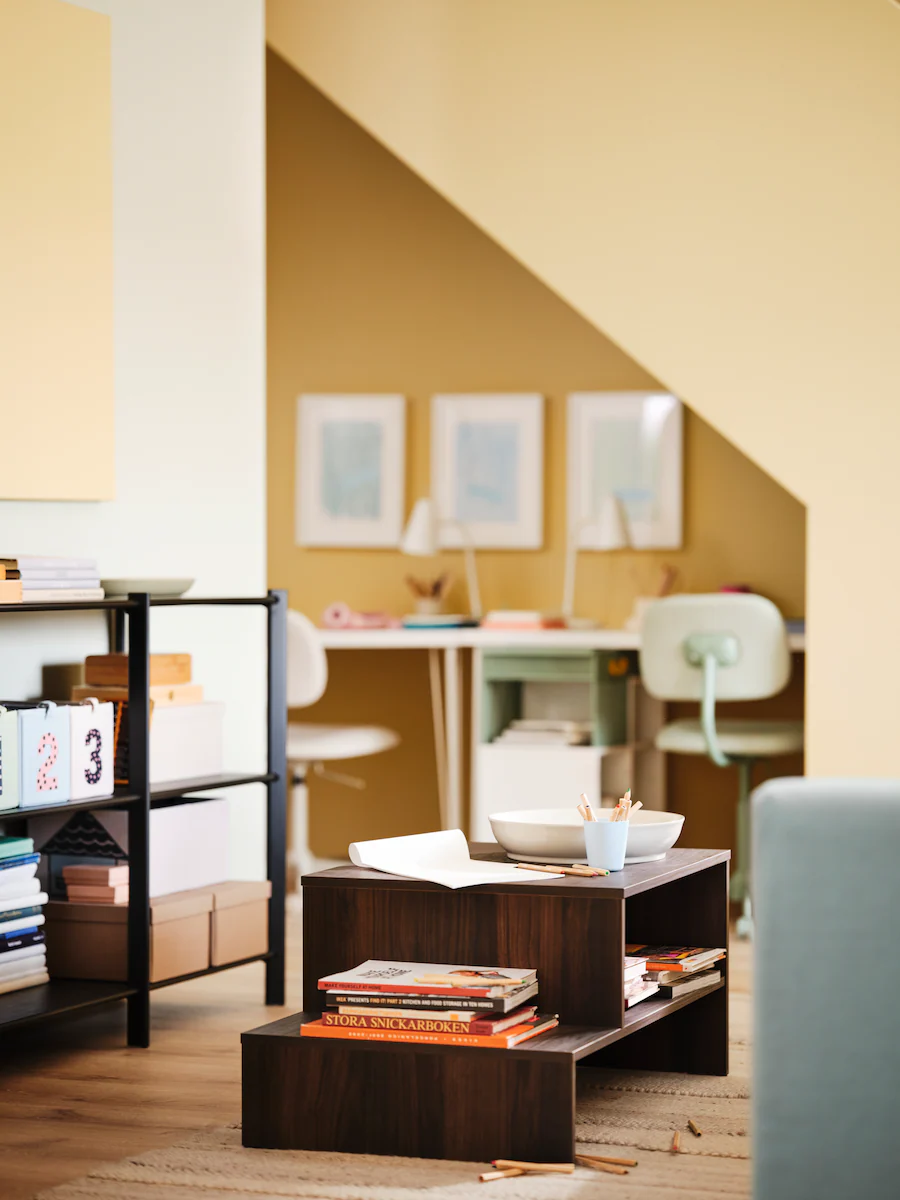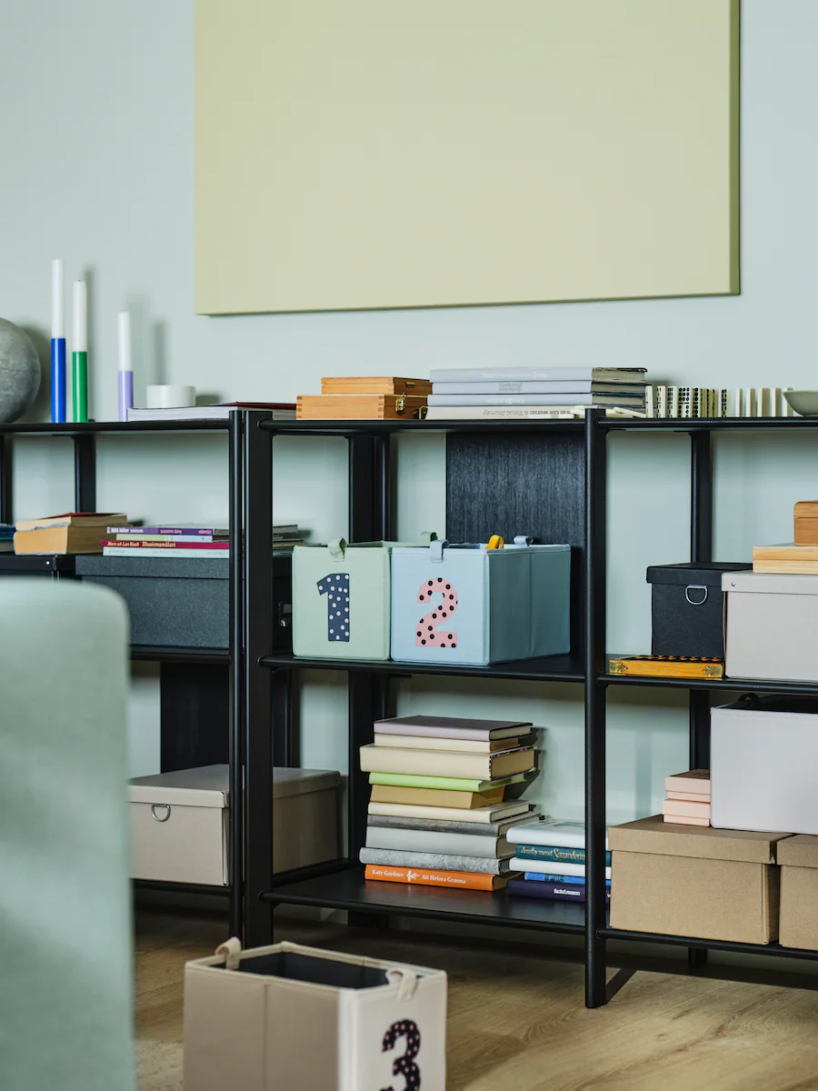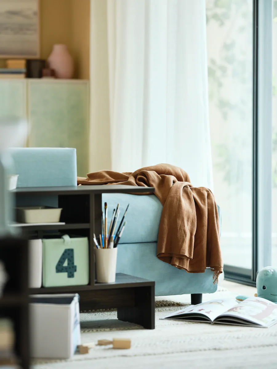 This living room is a hub for different activities so storage is key to keep things tidy. Open storage is great for easy access, like for books and often-used toys, while closed storage gives a more uncluttered look. The panel in this BILLY bookcase lets you display artwork or photos on the door.