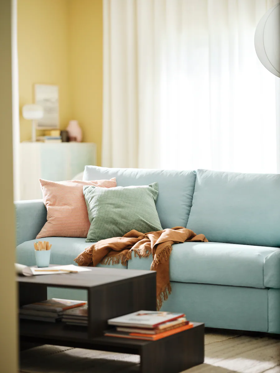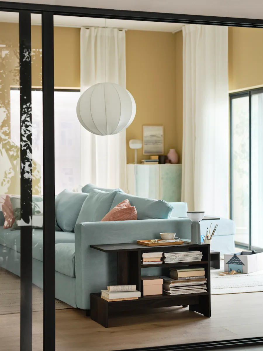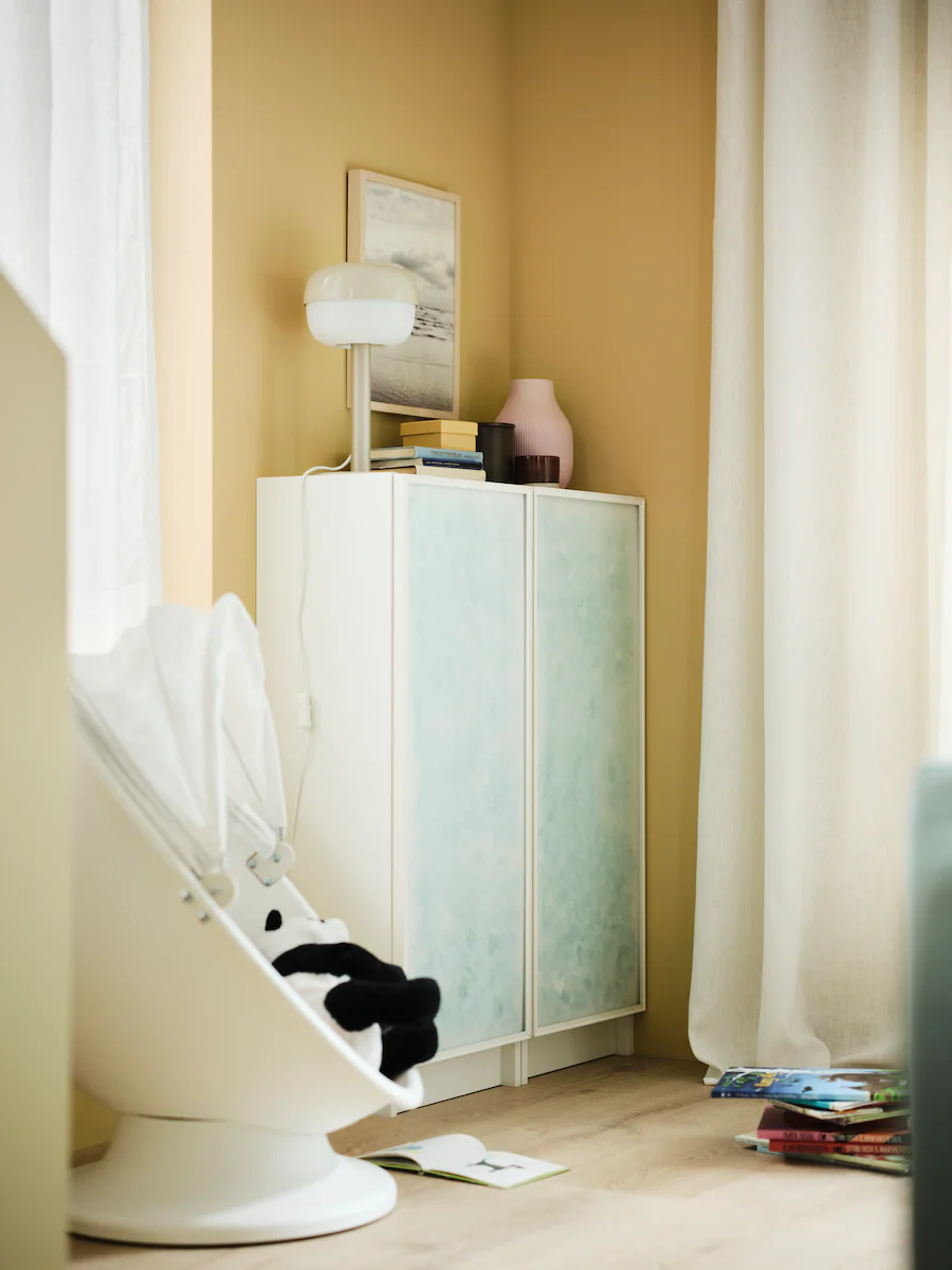 This living room is a hub for different activities so storage is key to keep things tidy. Open storage is great for easy access, like for books and often-used toys, while closed storage gives a more uncluttered look. The panel in this BILLY bookcase lets you display artwork or photos on the door.