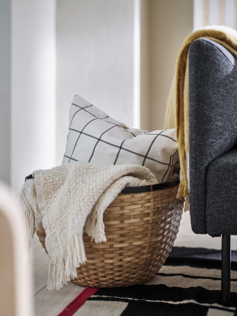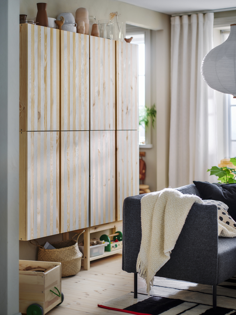 IVAR units provide lots of storage space behind calming closed doors. We’ve made them more personal by painting white stripes on the pinewood. A basket keeps cosy little extras ready for use. Light-coloured natural materials like bamboo and pine, strong, simple patterns – all strengthen the Scandi style, too.