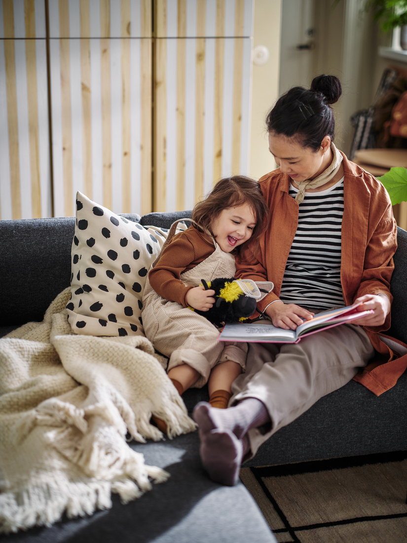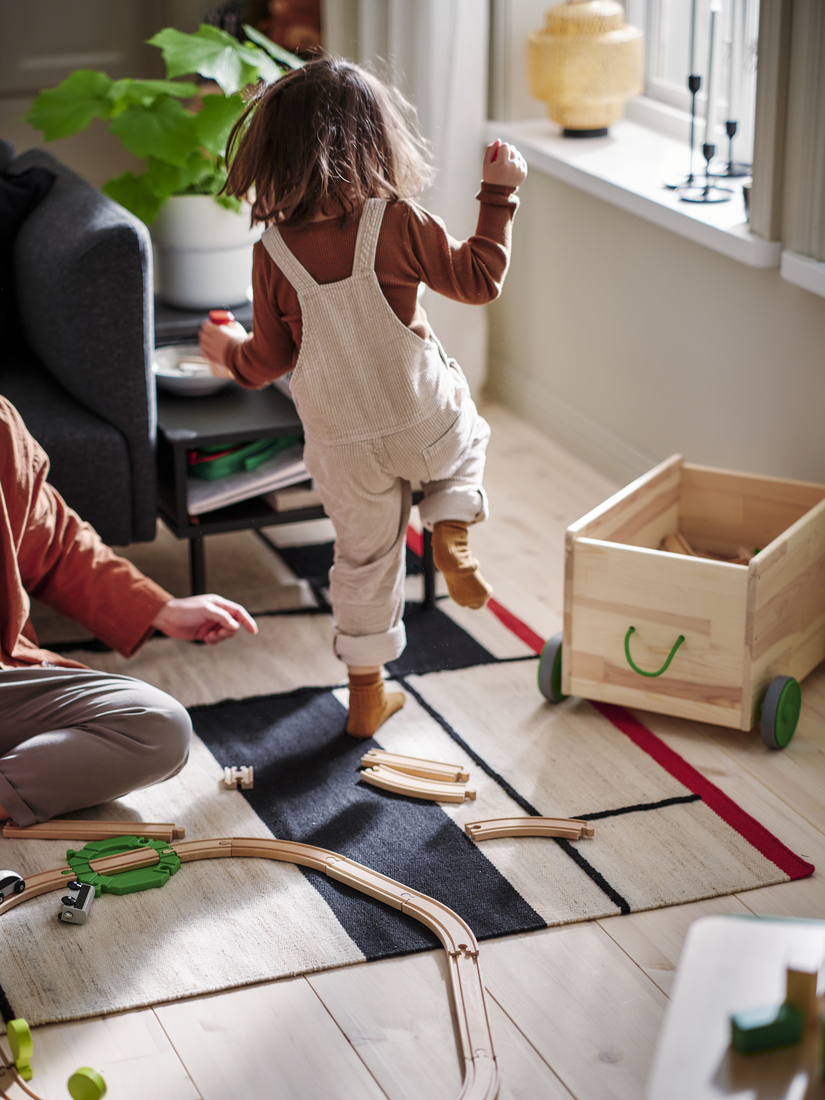 The room’s small but there’s still space to put your feet up and have fun together. Extra textiles, like the cushion with the playful ODDNY cover and the VALLKRASSING throw, add comfort and cosiness. And the handwoven wool RASTPLATS rug makes the floor softer to sit on while you wait for the train to arrive.