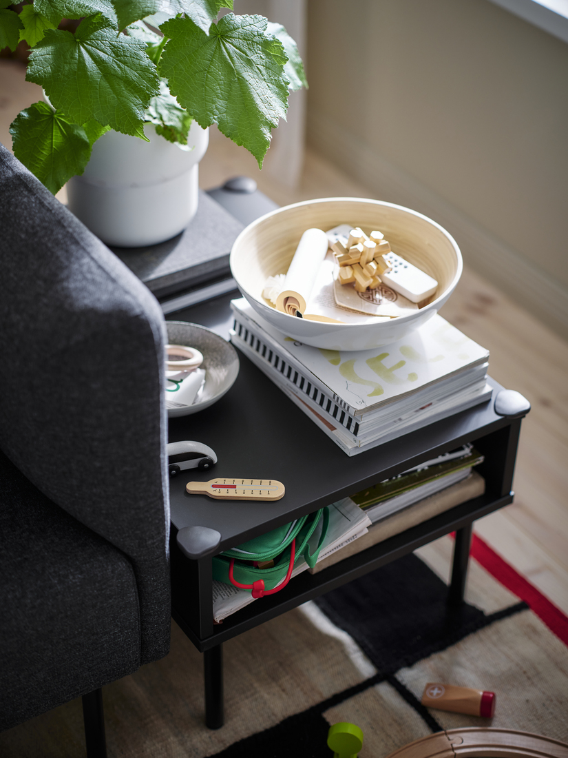 With its clean design and simple, rectangular shape, a TUNSTA side table fits perfectly into this modern Scandi living room. The shelf under the top gives you extra storage to help keep clutter under control – especially handy in a small room like here. We’ve put UNDVIKA corner bumpers on the corners. They’re easy to stick on to table edges and corners to reduce the risk of children getting hurt.