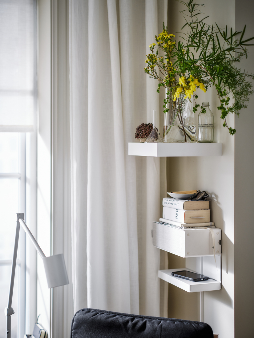 Light-coloured wood, white and elements from nature are big parts of this modern Scandi look. Here, the POÄNG armchair helps create the style as well as providing relaxing, supportive seating. The white curtains and shelves add freshness, with the flowers and vase kept out of children’s reach on the top shelf.