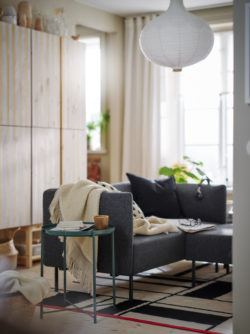 It’s small but this living room always feels like there’s enough space for everyone. These IVAR units provide a lot of storage to keep clutter away and their blond wood helps set the Scandi style. The look is strengthened by using bold geometric patterns like here in this RASTPLATS rug. And flexible furniture, like the modular LILLEHEM sofa or the GLADOM tray table, makes it easy to adapt things to the different activities of everyday life.