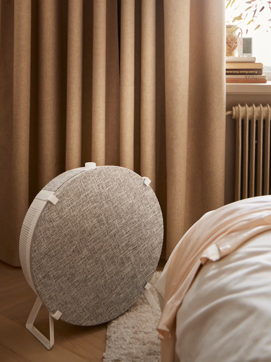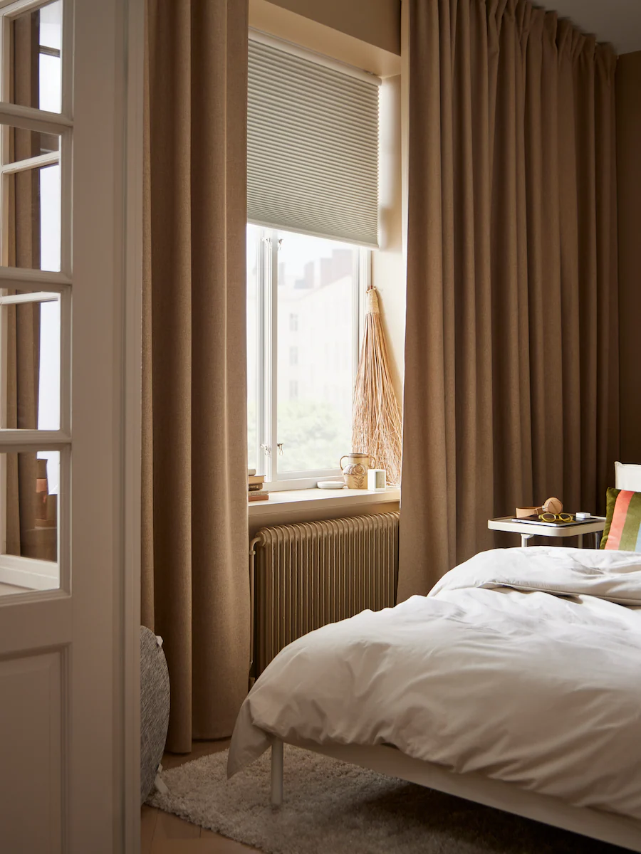 The curtains and wall have the same colour, creating a look that’s layered and sophisticated but calm, too. Even the air purifier looks calm, not technical, thanks to the fabric covering its front. It and the block-out blind are smart products, so you can control them with the IKEA Home smart app.