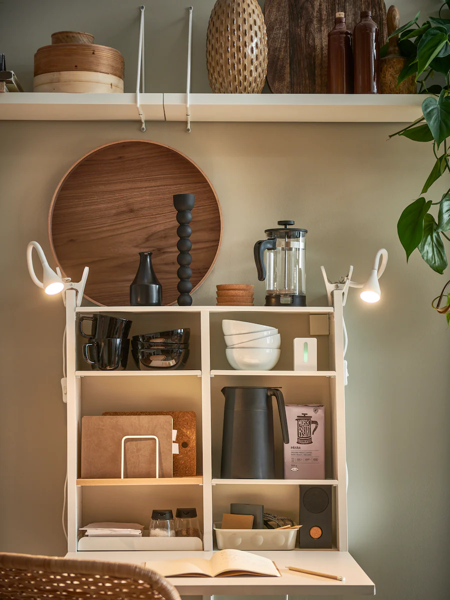 Filled with accessories in black, white and earthy tones, the wall-mounted drop-leaf table strengthens a graphic, coordinated expression. Apart from being a great spot for holding tableware conveniently close, that is.