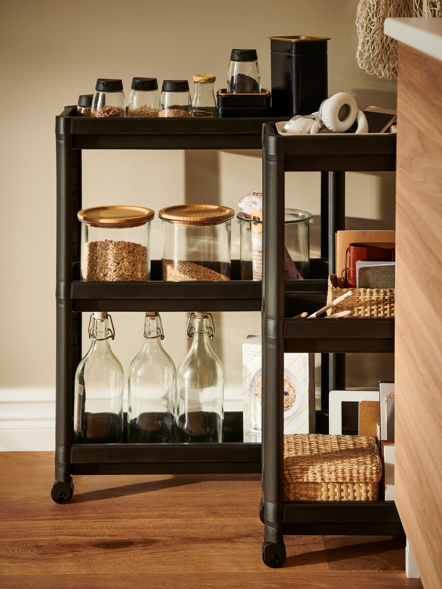 Besides contrasting nicely against the kitchen’s light wood and surfaces, a trolley is a great asset for storage or holding serveware. Add a second one and you have a mobile home for your work-from-home accessories, too.