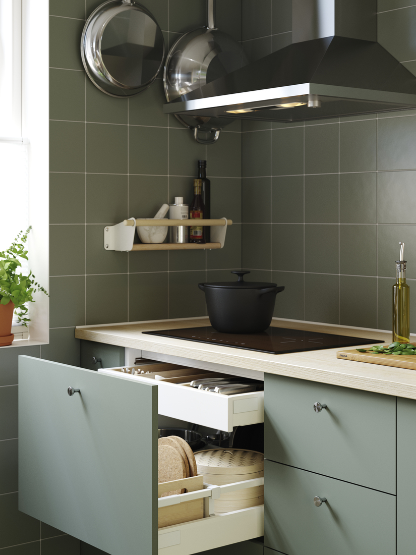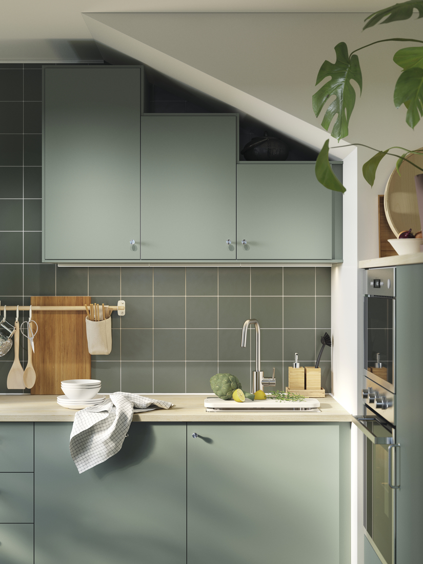 This L-shaped sage green kitchen has an air of modern simplicity, with matt NICKEBO kitchen fronts and sleek lines. The METOD cabinets, built to fit in perfectly, have space for most of your kitchen utensils so that you can keep the calm atmosphere throughout the day. With flexible and clever solutions, this small space kitchen has all you need for cooking, eating and socialising.