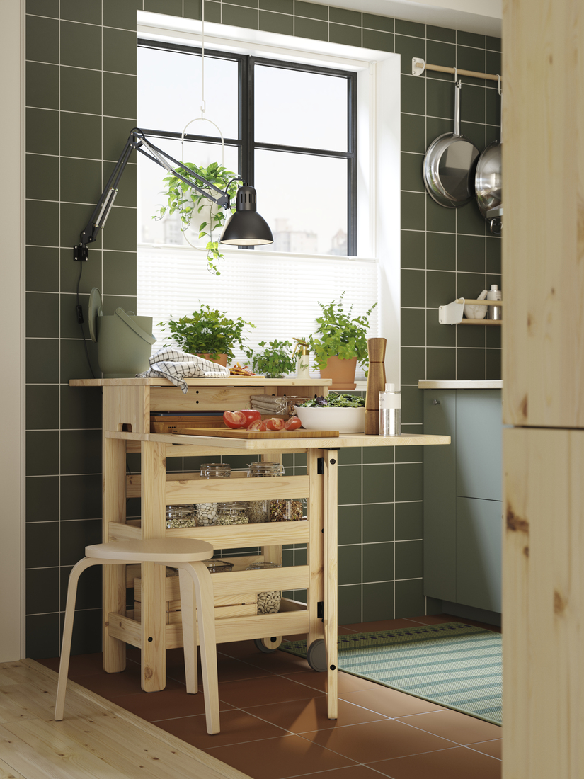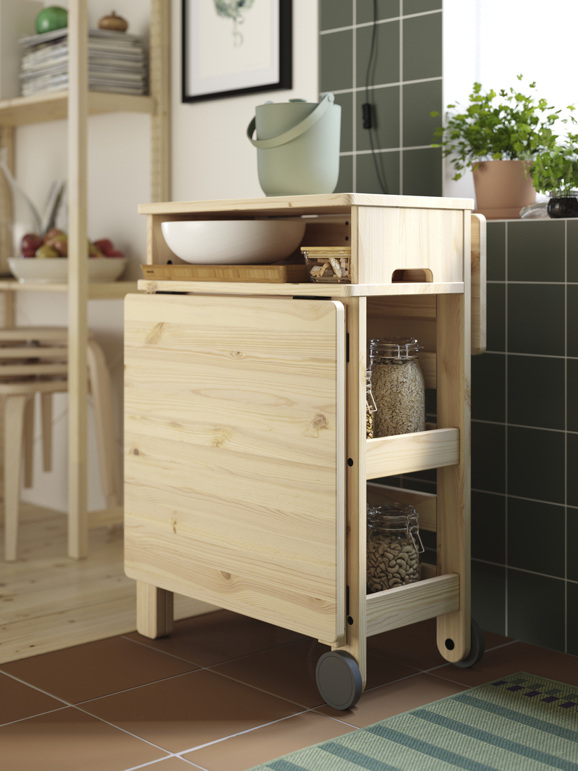 A flexible, space-saving, multi-functional companion, the RESARÖ mobile dropleaf table can be used for all kinds of activities. Fold it up to prepare food, have a meal, attend an online meeting or serve party snacks; fold it down to save space. Storage shelves on the sides keep things easily accessible.