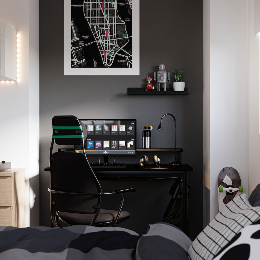 The bed might be the hub of your life, but a desk is a good complement. It can be regarded as a cockpit from which you steer everything. It doesn’t even have to be big to fit everything you need, and the shelf above it offers another opportunity to express your personality. Remember: It’s your room, your desk – your life!
