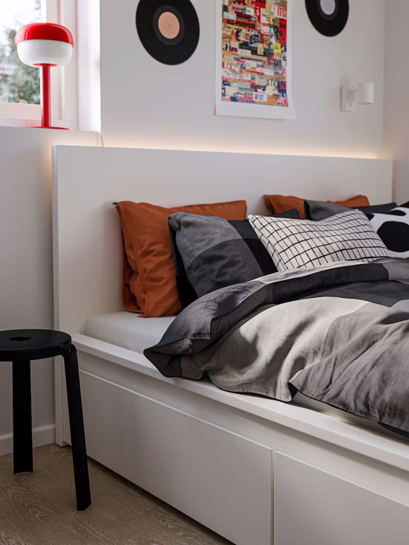 With extra pillows, a trolley on wheels, flexible lighting and a personal interest clearly showing on the wall above, a bed is pretty much all you need! To top it off, there are big storage drawers hiding underneath that bed, to make sure the room is easy to keep tidy. The only thing left to do is to choose a soundtrack for the day!