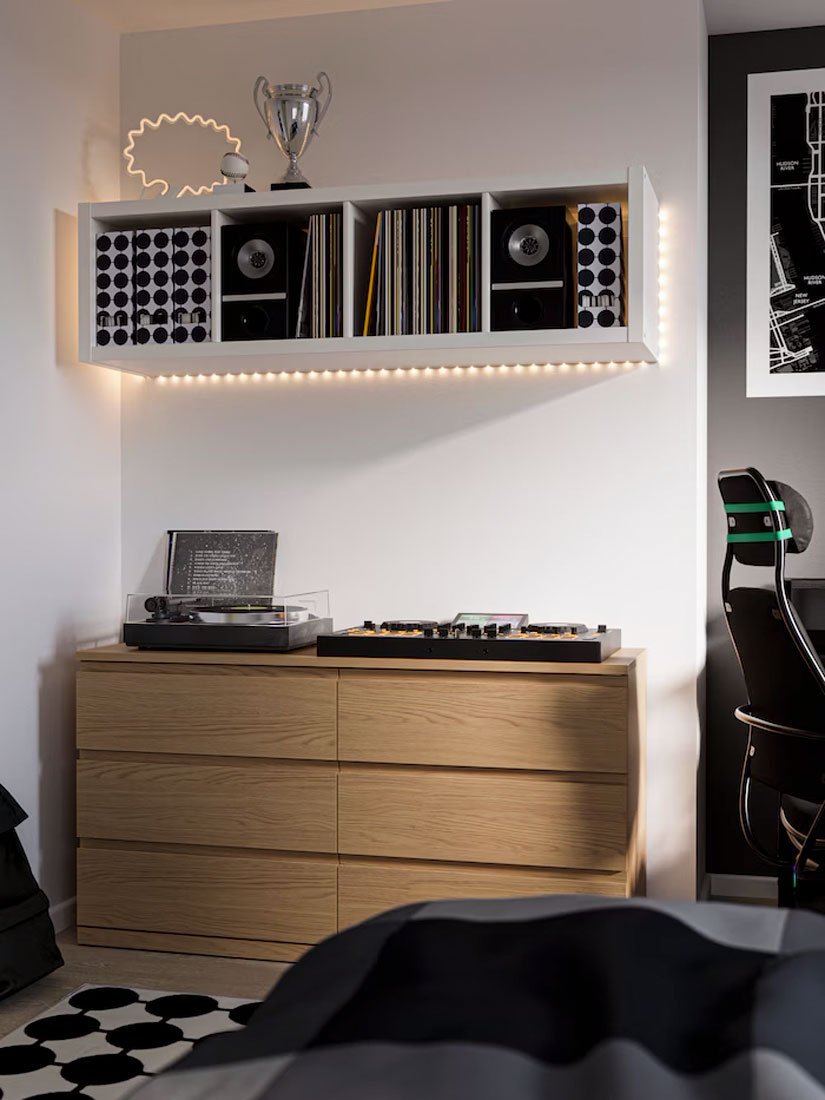 No one will have to know what it looks like inside those big drawers, the main thing is that the top of the chest of drawers is cleared to display the important things! Any hobby or interest can be turned into cool decoration details, if you make room for them. If you run out of space, just add a wall mounted shelf! It’s the best way to create extra storage and displays without taking up any more of the valuable floorspace.