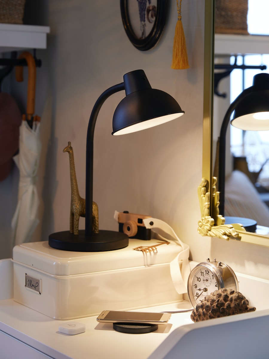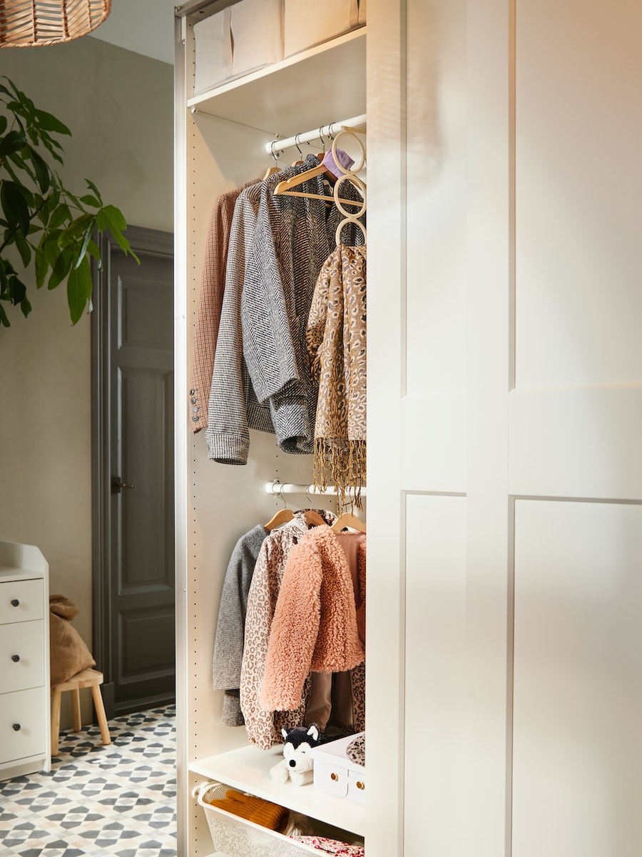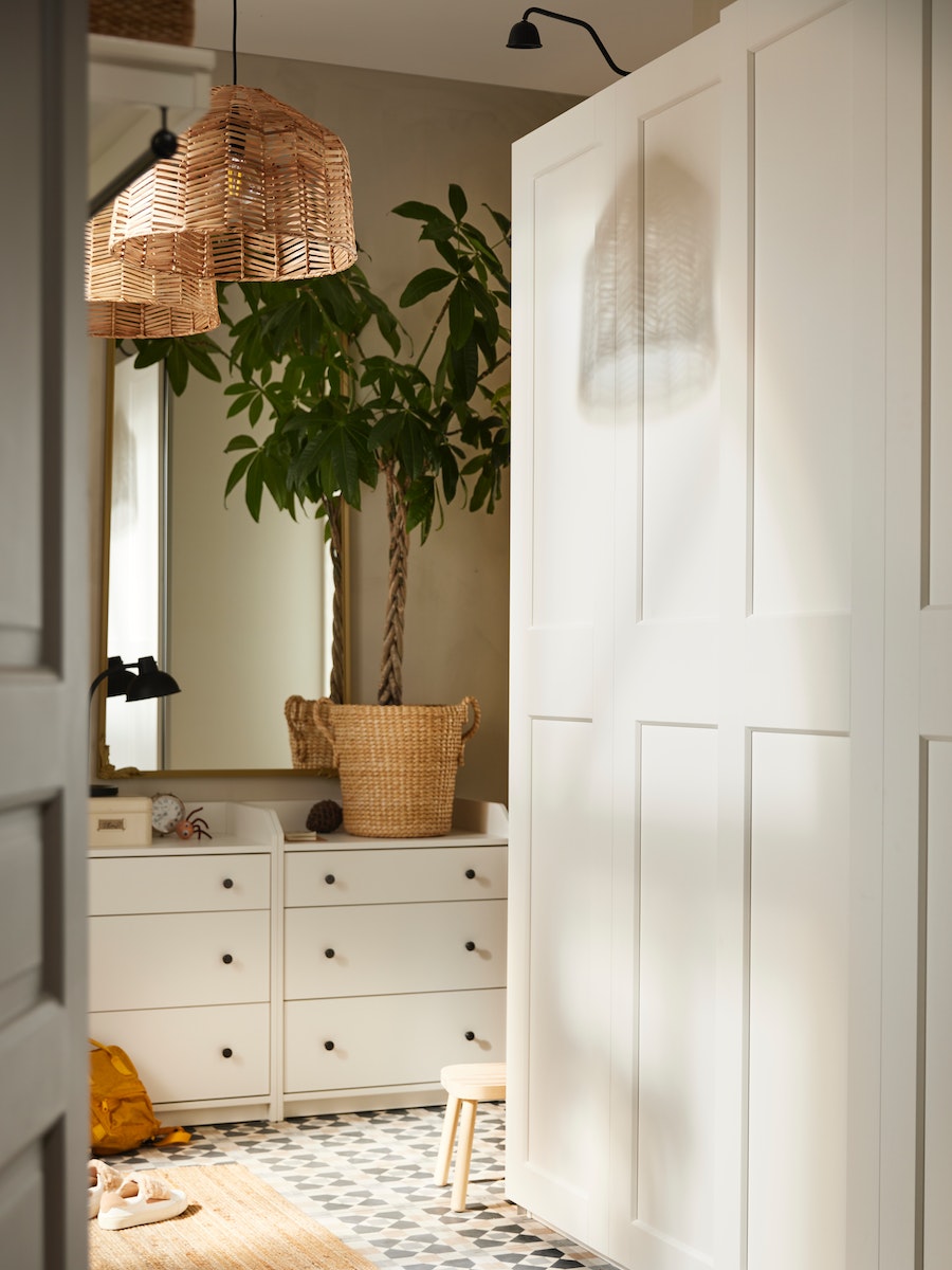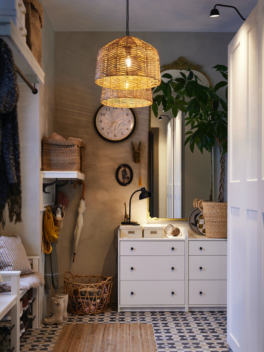 Practical things like finding your shoes are a lot easier with good light. This lighting is smart, too, so you can control it with a remote or your phone. Stylewise, this work lamp enhances the classic look, while the rattan pendant lamp shades and the shadows they throw boost the warm, welcoming feel.