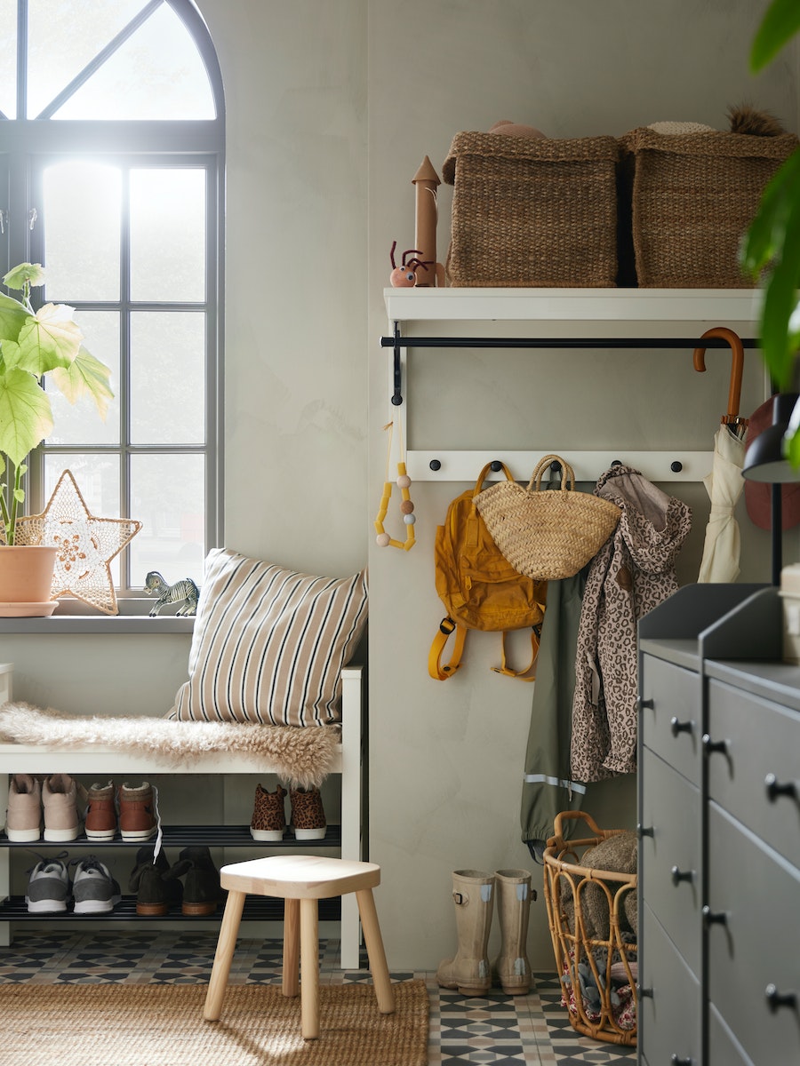 Hat racks and baskets at reachable heights for adults and kids, plus somewhere comfy to sit to put on your shoes, help this hall work smoothly for everyone. The natural materials and organic shapes of things like the baskets and lamp shades soften the look and create a warmer, more inviting ambience.