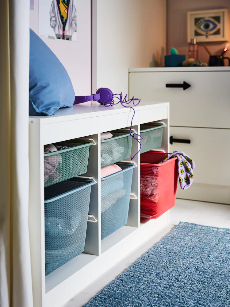 Here’s a relaxing area with nothing to hide. With soft, primary colours, these metal mesh storage boxes create their own colourful corner. The transparent mesh finish tones down the colour, supporting the gradient feel, as well as making a feature of the things inside without disrupting the overall look.