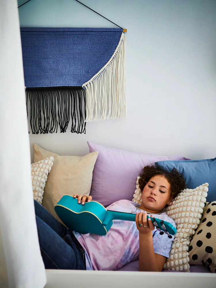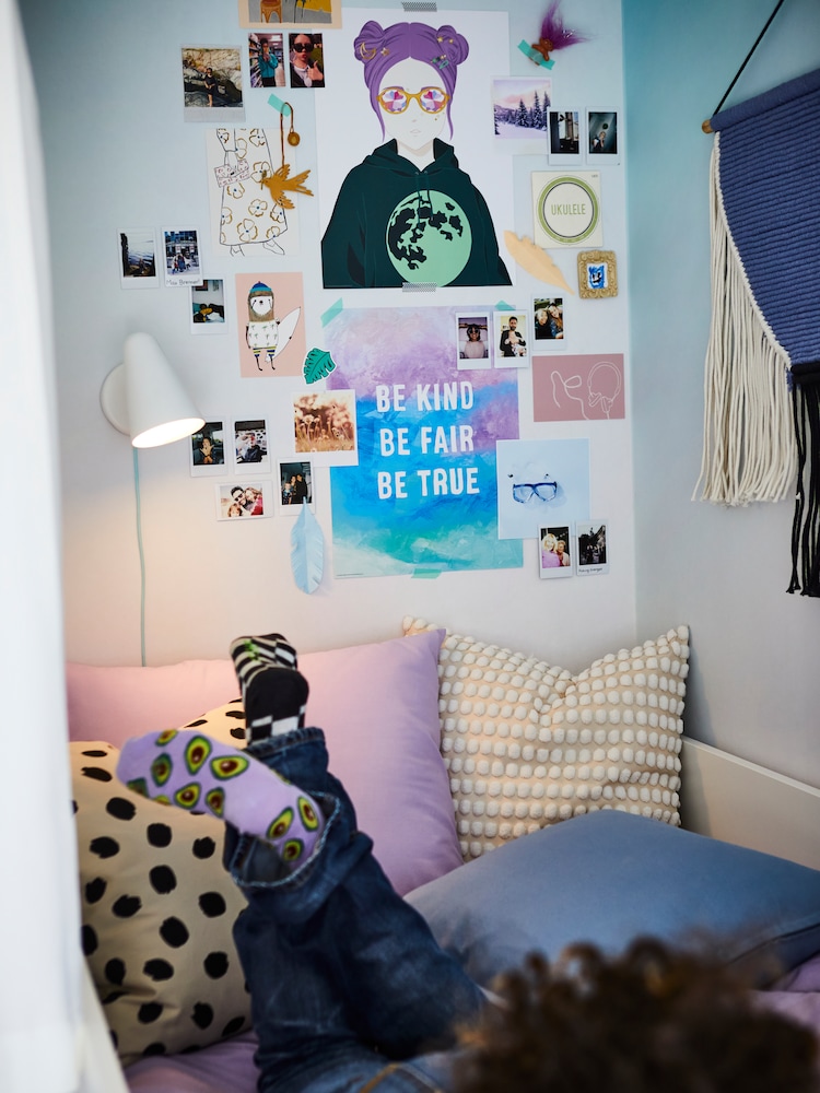 Fill the space with cosy textiles like plump, colourful cushions, rugs, curtains and soft bed linen to create eye-catching, inviting areas for chilling out, as well as fun backgrounds. Add accents with different textures and patterns to keep the dreamy, other-worldly feel going.