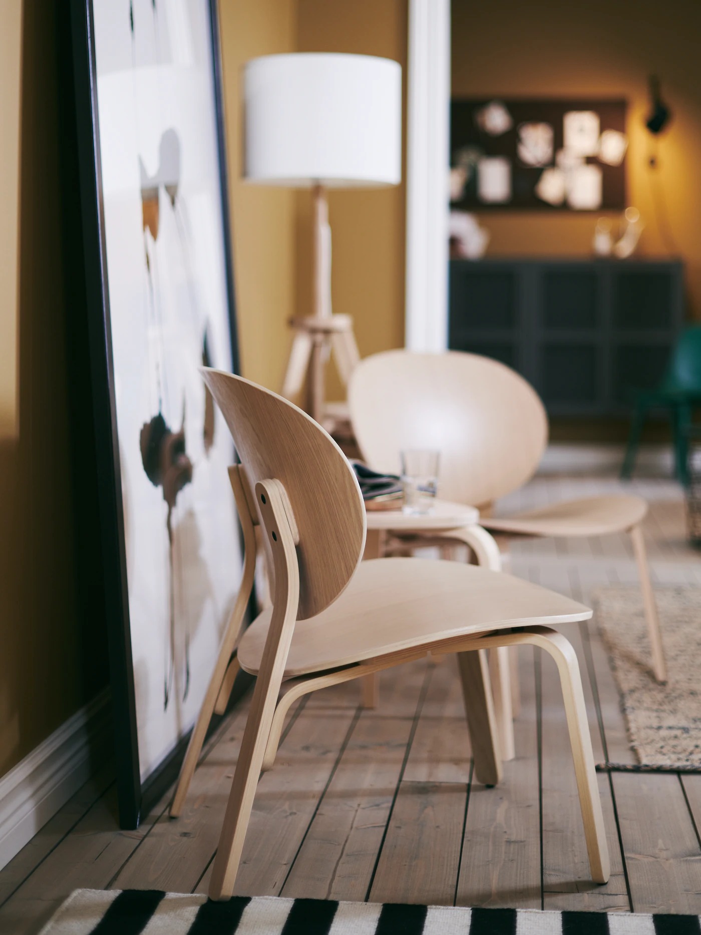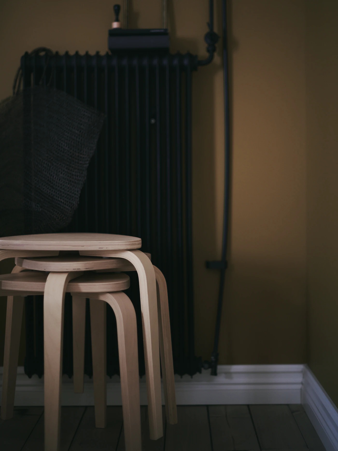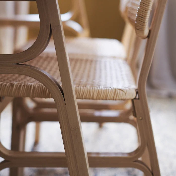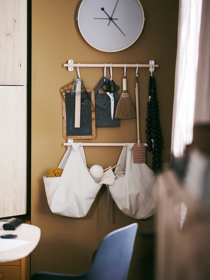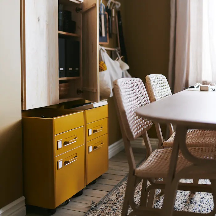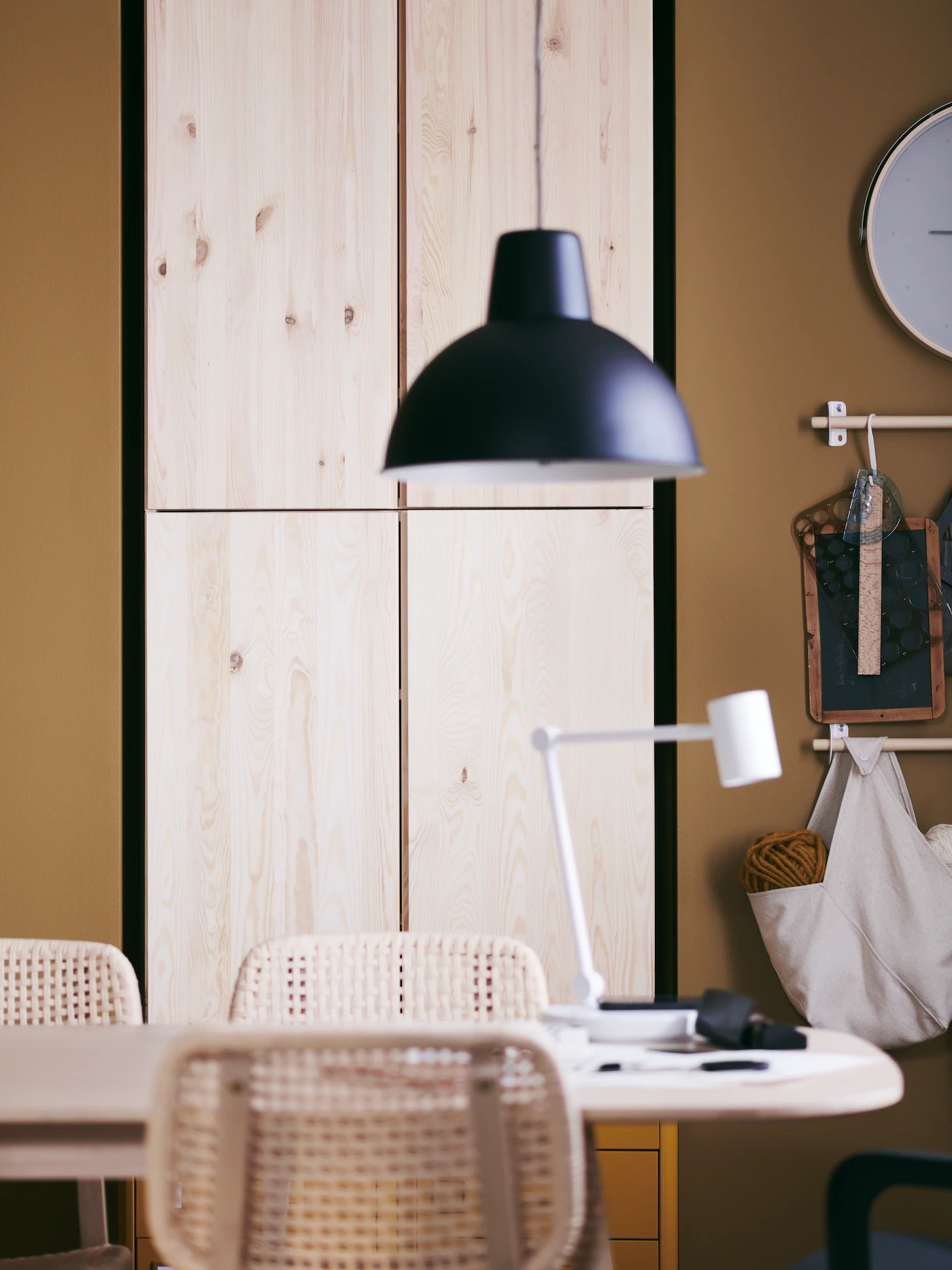 This bamboo dining table is the scene of many cosy suppers and gatherings with loved ones. It’s also where deadlines get chased and creative juices flow. The secret to fitting so many functions into one small space comes down to the flexible storage nearby. Craft supplies go on the rails, tableware is taken care of by the double cabinets in solid pine, and the two drawer units tucked below pack away the paperwork.