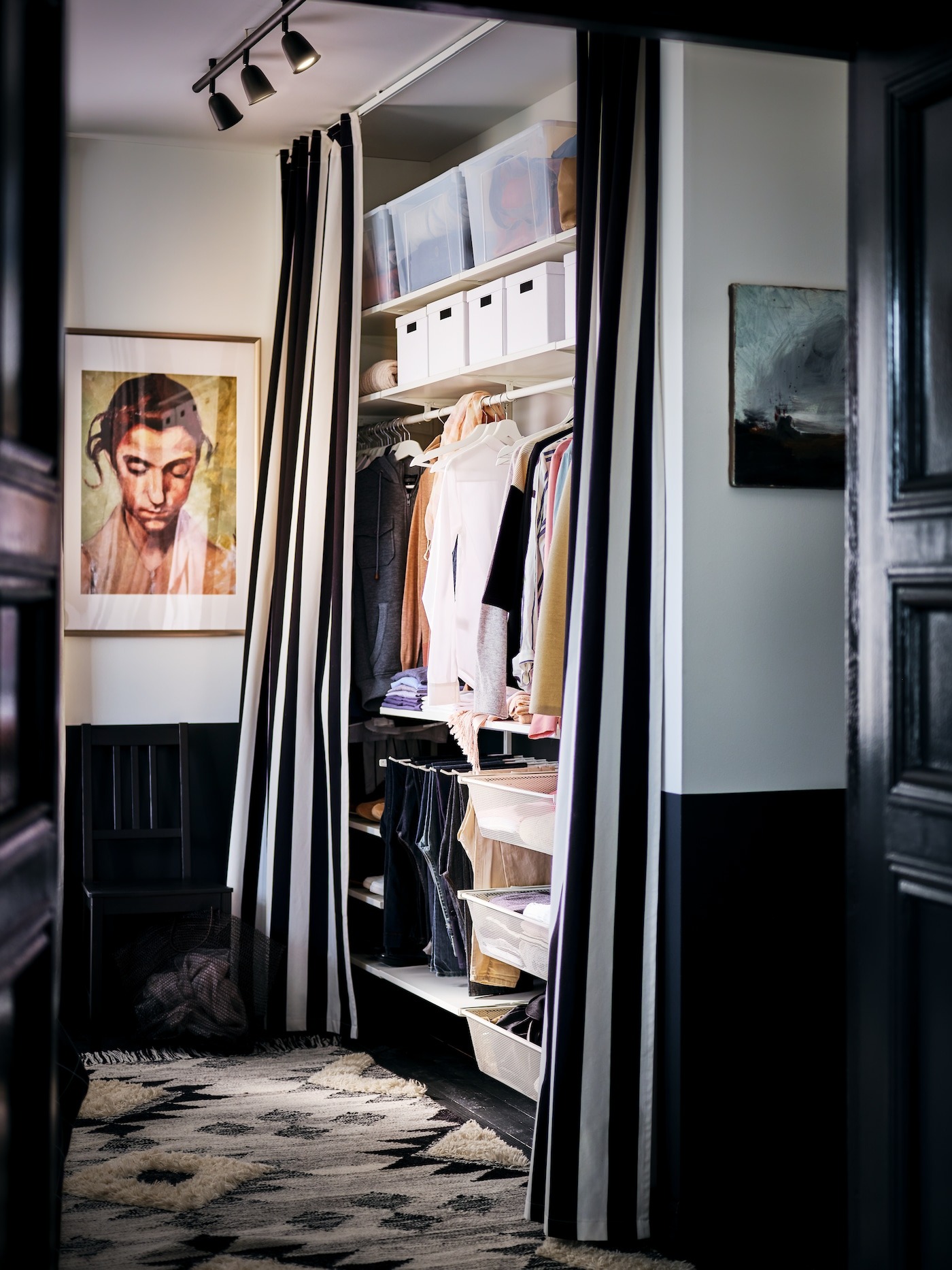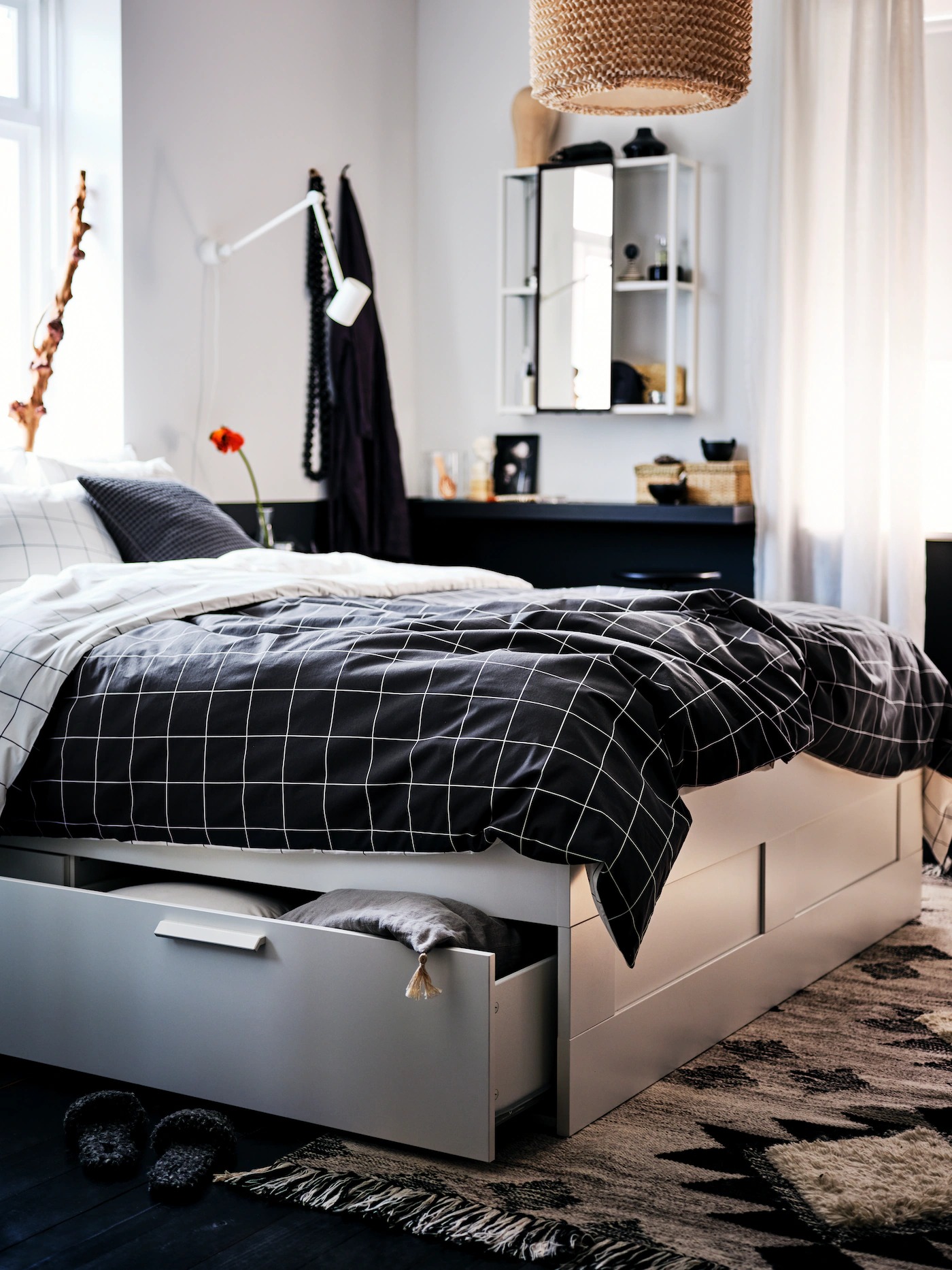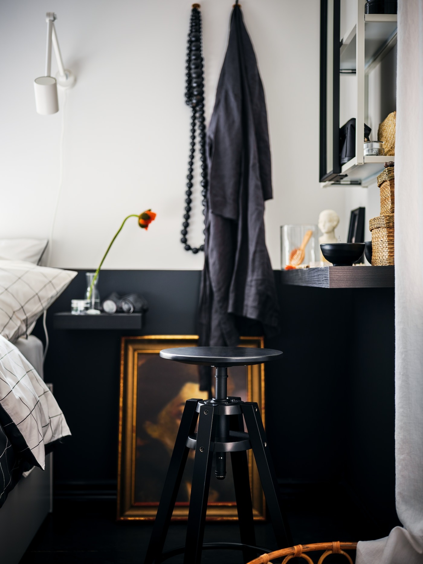 Without much room to spare, this bedroom has clever solutions packed into every nook and cranny. In here you’ll find a bed that doubles as a chest of drawers, a full-height storage unit with curtains instead of doors, and a compact vanity created from a simple floating shelf, with just enough space below to tuck away a stool.