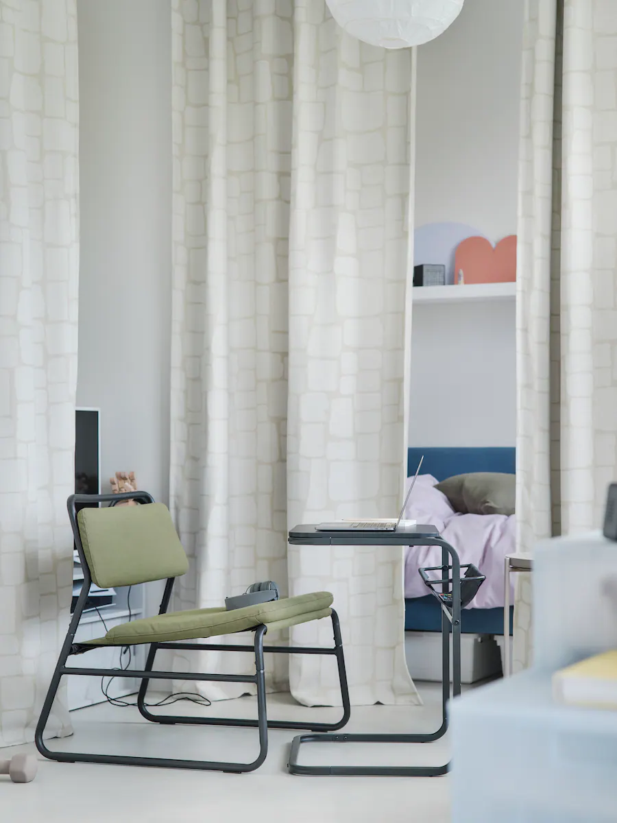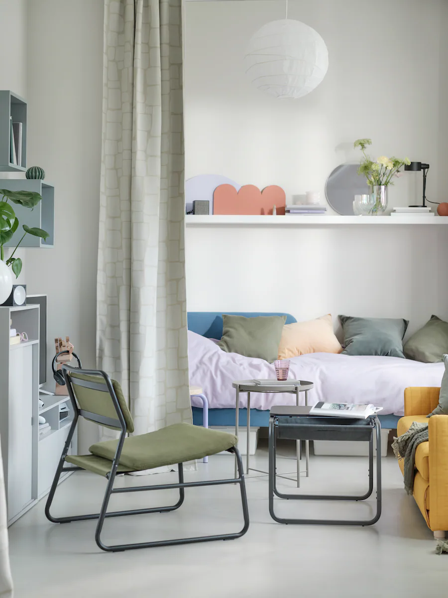 Life is everchanging, and so is home. Here, we created a cosy corner in the middle of the room for study-time, by placing an airy olive-green easy chair with a minimalistic and versatile side table. You can quickly transform it into a coffee table when friends visit. Pull the curtain when you need to focus.