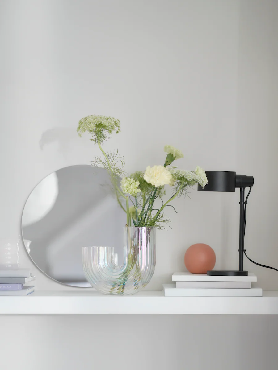 An open shelf above the bed makes a stylish display for an easy update. Elegant, at the same time playful, this rainbow inspired vase has a shimmering finish and a groove pattern. Put your favourite flowers in it – or enjoy it as beautiful glass sculpture. A black lamp adds a bit of an attitude to the mix.