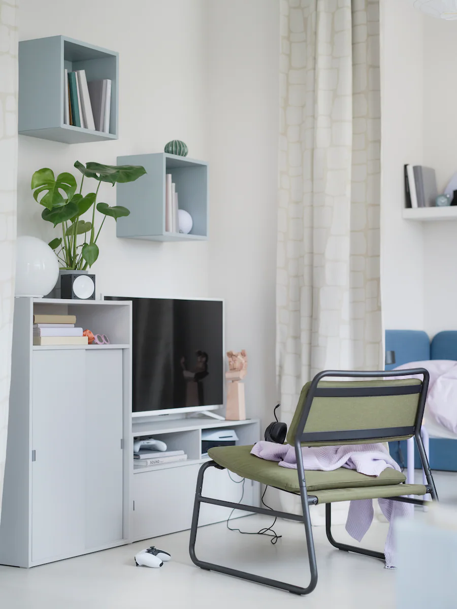 Simple design but rich in functions, this gaming zone with TV bench, cabinet and easy chair offers many possibilities with both open and closed storage. Sliding doors gives a clean look and are perfect for narrow spaces. We also made use of the wall with coordinated cube cabinets for a striking look.