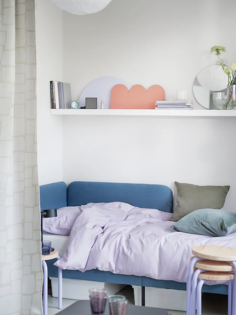 Transition from a good night’s sleep to daytime lounging nook seamlessly with an eclectic bed and a textile room divide. Choosing a block-out curtain will help you fall asleep, and rich pattern in tones of beige adds an air of elegance to your space (and makes it cosier, too).